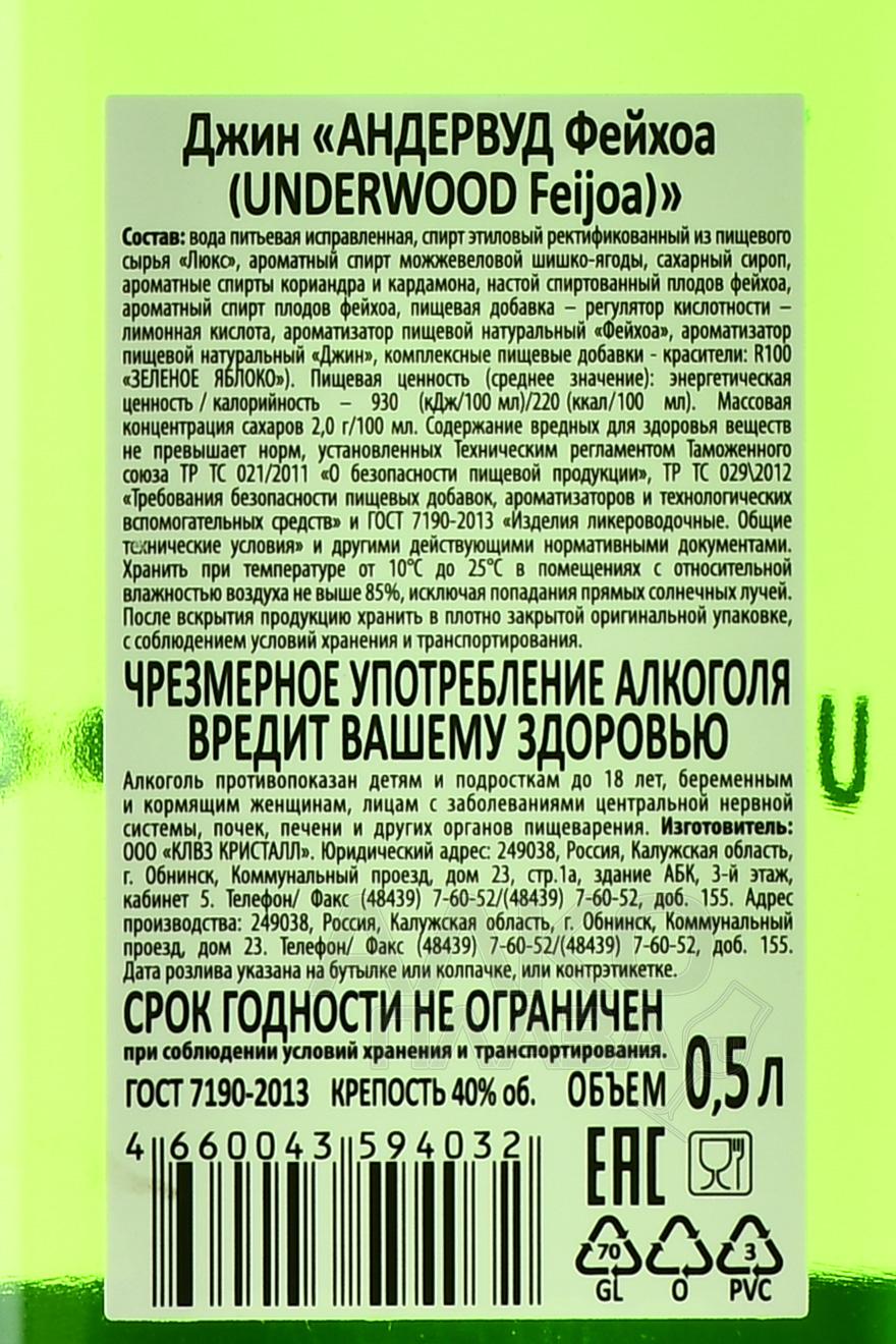 Джин Underwood Feijoa 0,5 л — напиток российской популярной торговой марки (она представлена в обширном ассортименте предприятия из Калужской области), который не содержит искусственных добавок. Основой многокомпонентного состава стал качественный спирт класса «Люкс», настоянный на выверенных пропорциях ягод можжевельника, плодов фейхоа, душистых пряностей и прочих ингредиентов с выразительными оттенками букета. Перед розливом по стильным графинам настой купажировали очищенной водой, чтобы его спиртуозность снизилась до сорока процентов.
