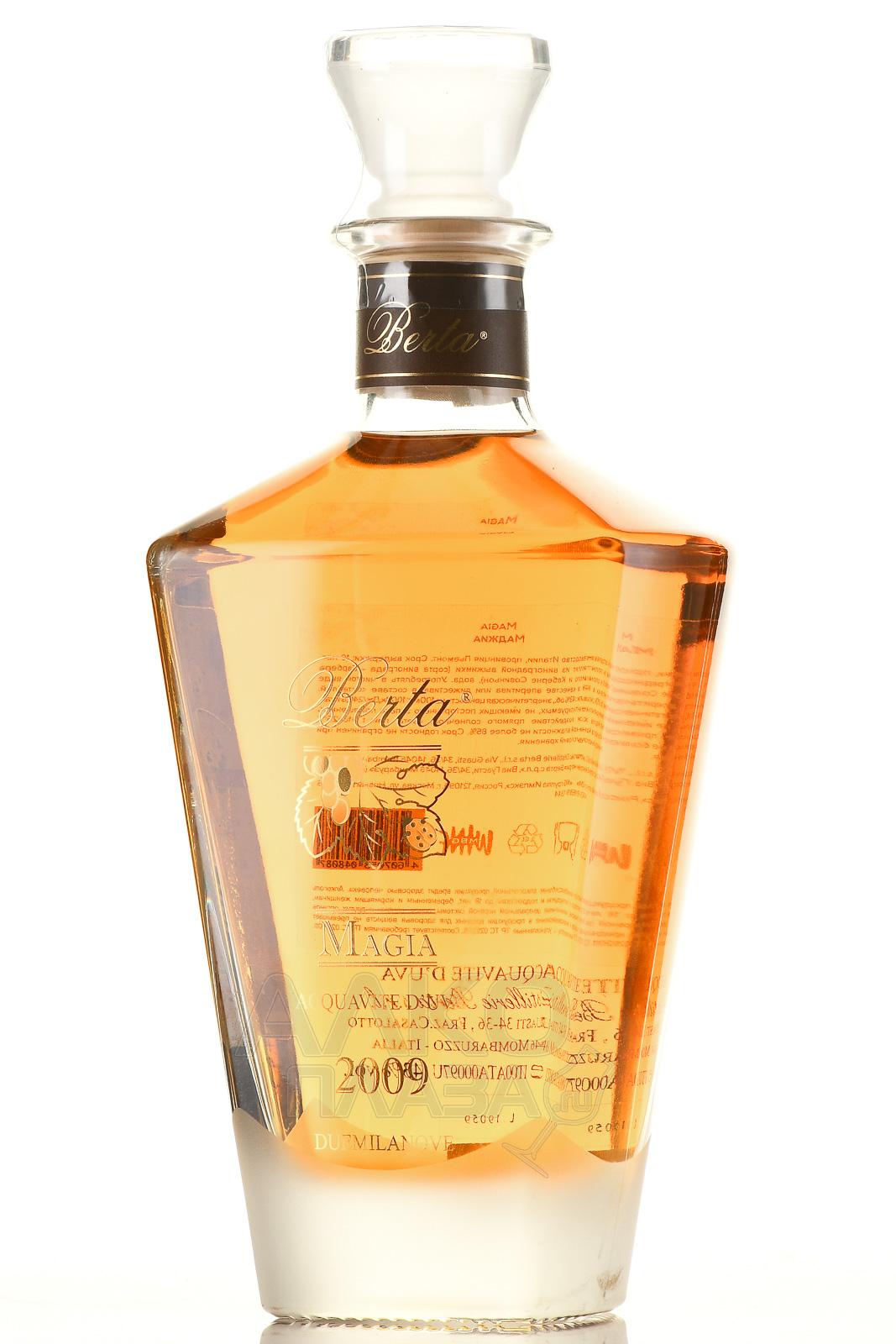 Граппа Berta Magia 2009 г. 0,7 л в д/у – винтажный сорт спиртного в презентабельном боксе из дерева. Напиток изготовлен из пьемонтского винограда. Сырье (кожицу и косточки с остатками мякоти) сбраживают в специальных резервуарах, а полученное сусло перегоняют в паровых кубах. Для купажирования отбираются только самые ароматные спирты без примесей. После длительного созревания в бочках из разных пород дерева дистилляты смешивают и бутилируют. Мезгу, оставшуюся от производства, собирают и отправляют на заводы по изготовлению масла из косточек винограда и топлива из прессованной и высушенной кожуры.