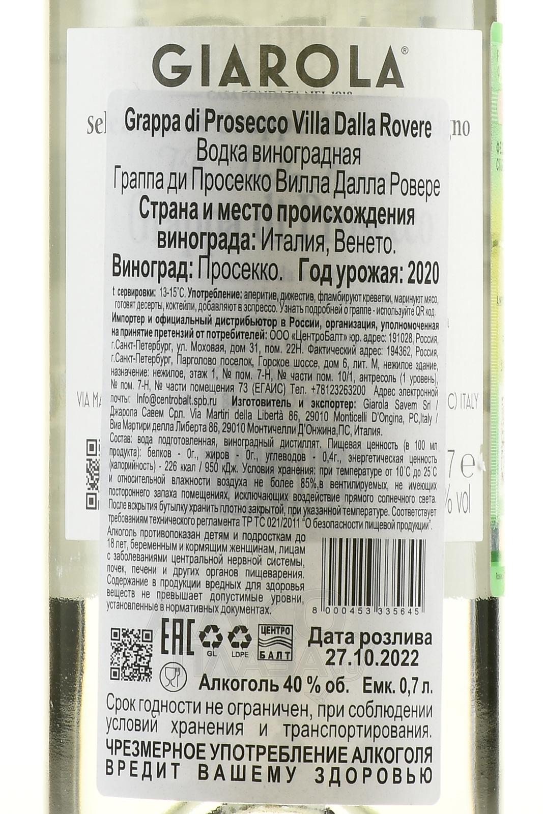 Граппа Giarola Di Prosecco Villa Dalla Rovere 0,7 л создана в традиционном итальянском стиле, для которого важна чистота вкуса и аромат. Напиток производится из сорта Глера, выращенного в области Венето. Сок первого отжима используется для игристого вина просекко, а виноградная мезга сбраживается и дистиллируется в медных аламбиках. Затем ароматный спирт недолго выдерживается в стальных емкостях и разбавляется водой до нужной крепости. Молодая граппа сохраняет свежесть и сортовые особенности винограда. Ди Просекко Вилла Далла Ровере считается одним из лучших в линейке Джарола и регулярно получает положительные отзывы за сбалансированный вкус и элегантный характер.