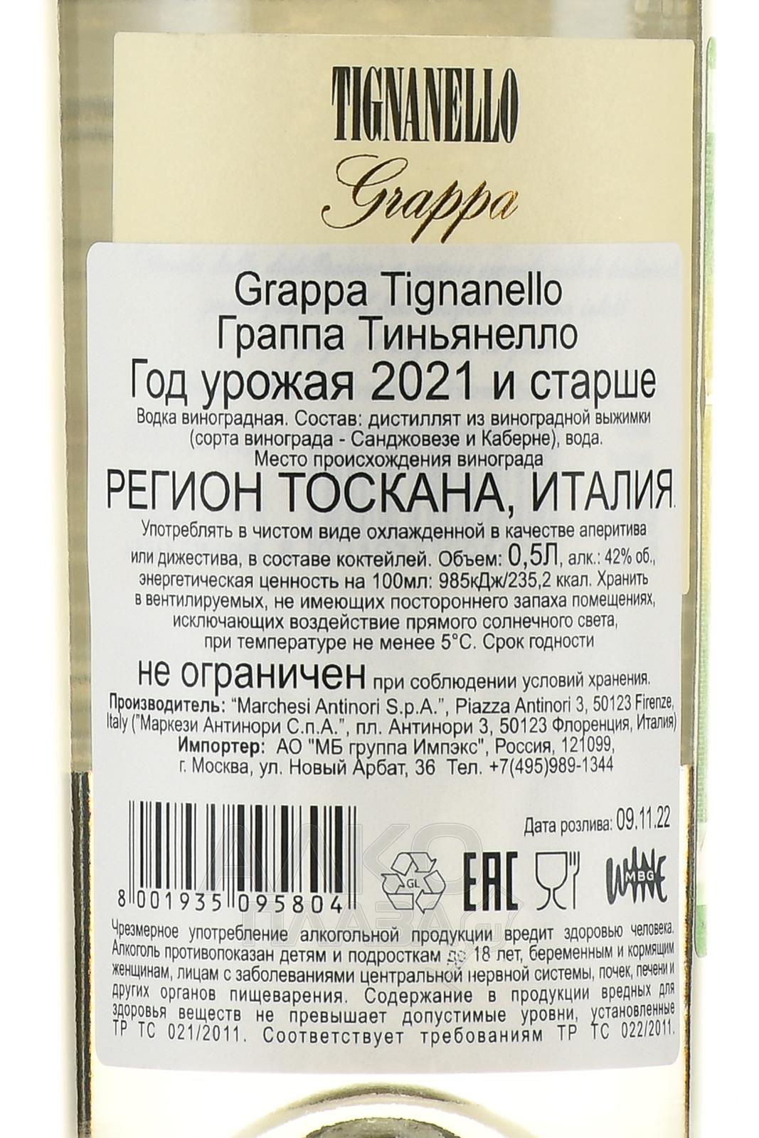 Граппа Tignanello — качественный итальянский напиток из региона Тоскана, который предлагается культовой семейной компанией при 42-градусной крепости. В его составе присутствуют выжимки двух красных сортов винограда, прошедшие стадию перегонки. Граппа поставляется молодой в прозрачных бутылках, укомплектованных подарочными белыми картонными коробками прямоугольной формы.