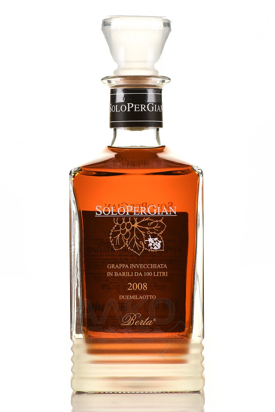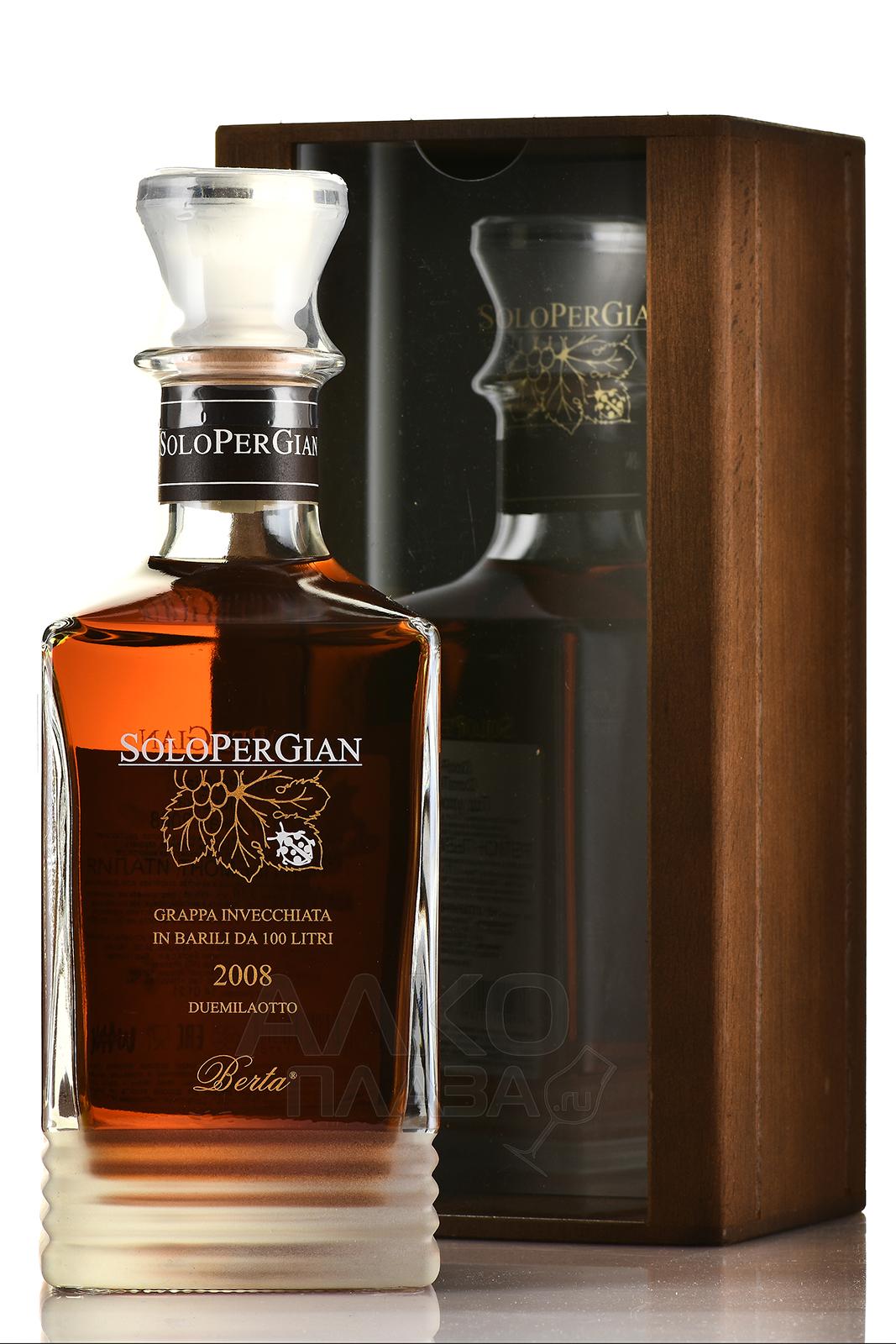 Граппа SoloPerGian Berta 2008 года 0,7 л в д/у — это коллекционный дистиллят, созданный в память о Джанфранко Берта, одном из основателей знаменитой винокурни. Напиток получил свою индивидуальность благодаря соединению трех лучших сортов (Tre Soli Tre, Roccanivo, Bric del Gaian). Купаж 10 лет выдерживался в новом погребе, в дубовых бочках разного объема — от 100 до 1200 литров. Такой процесс позволил напитку обрести глубину, сбалансированность и утонченный характер. Особенность этой граппы в том, что длительное созревание в дереве раскрыло редкие оттенки букета, а сама бутылка стала предметом высокой оценки критиков. СолоПерДжан отмечена как одна из самых изысканных грапп Италии, что делает ее востребованной среди ценителей редких спиртных напитков. Фирменная упаковка — прозрачный графин с массивной пробкой и строгая деревянная коробка — подчеркивает исключительность выпуска. Версия из урожая 2008 года получила 95/100 баллов от Falstaff и 5 «гроздей» от Bibenda.