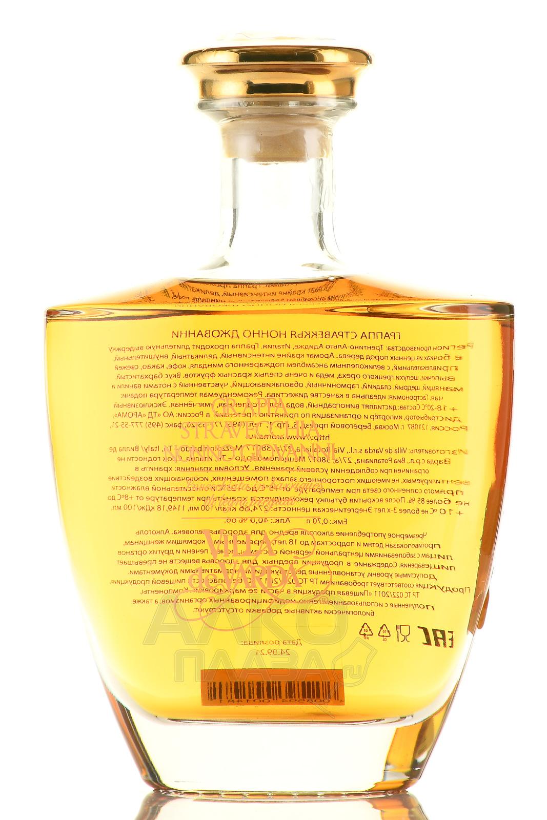 Граппа Villa de Varda Stravecchia Nonno Giovanni 0,7 л — популярный итальянский напиток от компании из области Трентино-Альто-Адидже, в котором объединены высококлассные виноградные спирты. Их получили в результате сбраживания при постоянном контроле температурных значений и долгой перегонки в медных кубах. Сорокаградусная граппа выдерживалась в барриках из французского дуба. 40-процентный алкоголь предлагается в стильных графинах с крышками золотистого оттенка. Дополнительной упаковкой служит солидный деревянный бокс, украшенный символикой производителя.