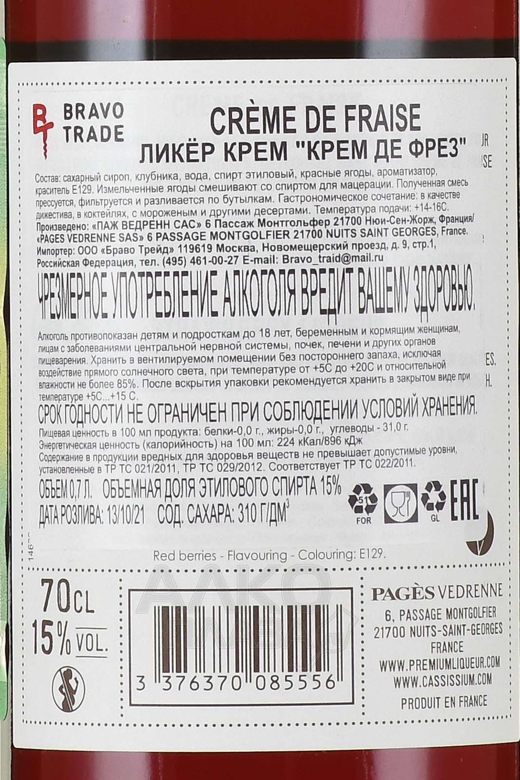 Ликер Creme de Frais 0,7 л – премиальный французский плодовый алкоголь крепостью 15 градусов, основой изготовления которого служат спелые сочные ягоды клубники. Измельченные ягоды соединяют с высококачественным спиртом и настаивают во вращающихся стальных емкостях без доступа воздуха и света, что позволяет сохранить яркий аромат и максимум вкуса ягод. Полученную смесь отжимают, фильтруют и разливают по бутылкам.