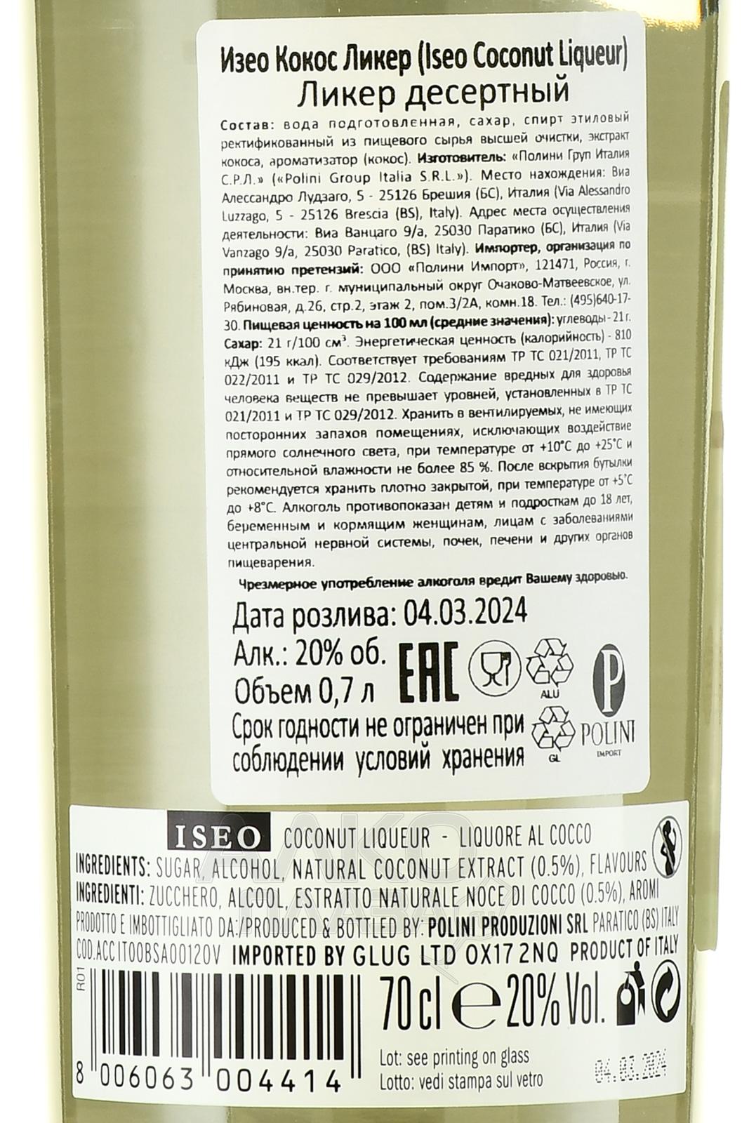 Ликер Iseo Coconut Liqueur 0,7 л — спиртное десертной категории, которое обладает выразительным и натуральным букетом благодаря присутствию в основе ингредиентов натурального происхождения: премиального спирта-ректификата и экстракта кокосового ореха. Полный процесс производства выполнили на итальянском заводе, где были проедены мацерация и бережная фильтрация. Бутылка с ликером оборудована многоразовым дозатором, поэтому ее использование будет максимально удобным.