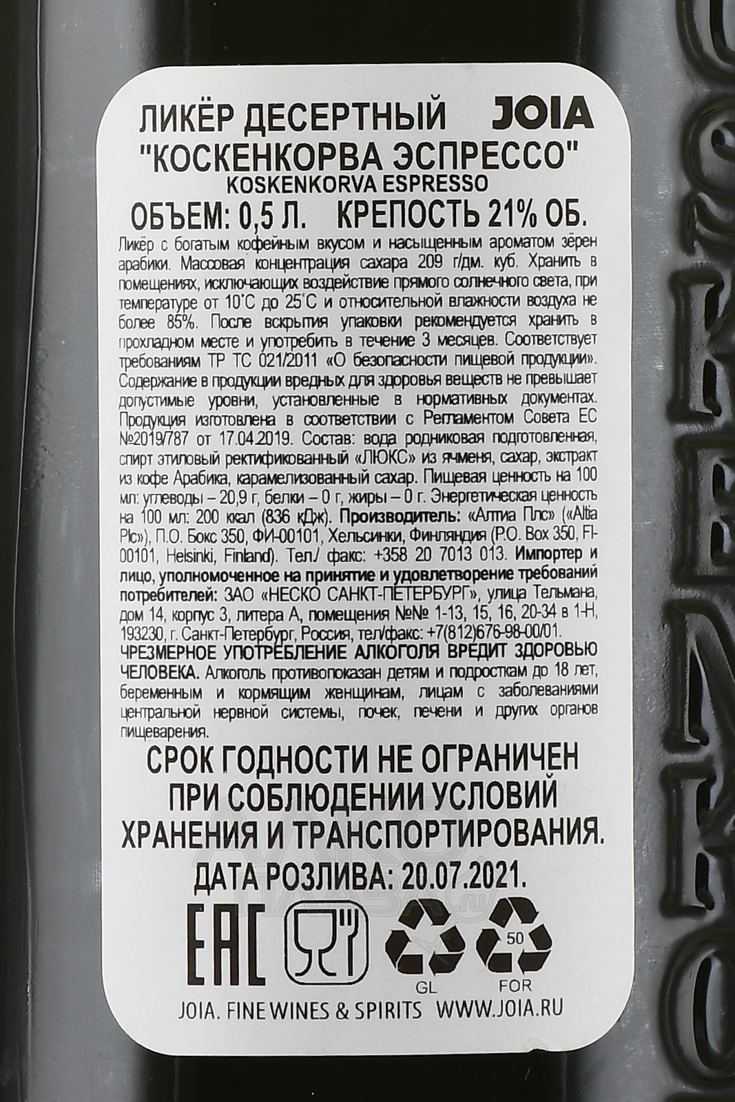 Ликер Koskenkorva Espresso 0,5 л относится к классу десертных и изготавливается в соответствии со стандартами ЕС. Его главным ингредиентом является спирт «Люкс», который производится из сортового ячменя путем непрерывной дистилляции. В алкоголь добавляют родниковую воду, экстракт из отборной арабики и карамель.