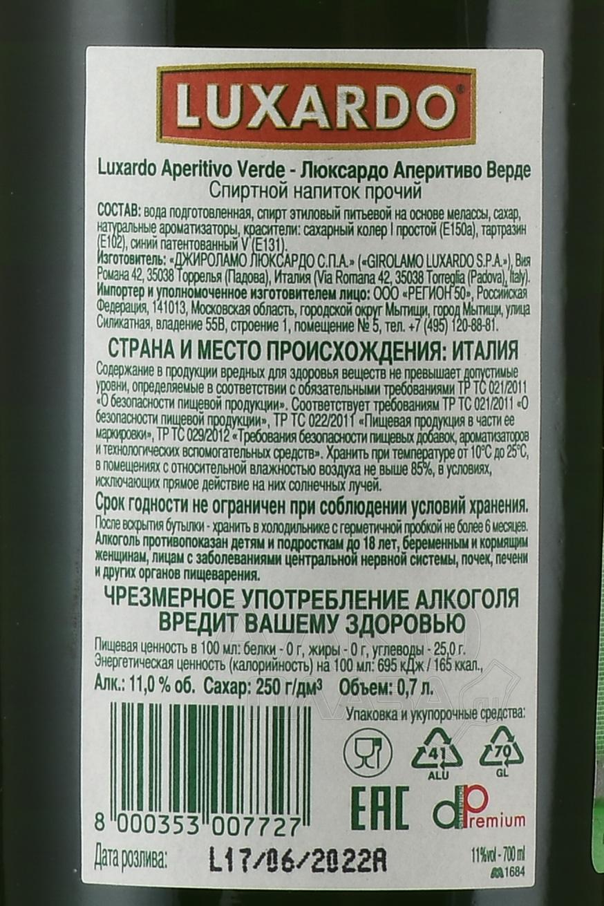 Аперитив Luxardo Aperetivo Verde 0,7 л относится к категории сладких и содержит 250 г сахара на дм куб. Крепость напитка — 11%. Его основой является ректификованный спирт, полученный из мелассы (патока, остающаяся при переработке сахарного тростника). На нем настаивают эксклюзивную композицию из растительных ингредиентов, среди которых ревень, горечавка, цедра и др. Точную рецептуру итальянский производитель не афиширует. Аперитив привлекает внимание своим необычным зеленым оттенком. Это идеальный компонент для ярких и оригинальных коктейлей.