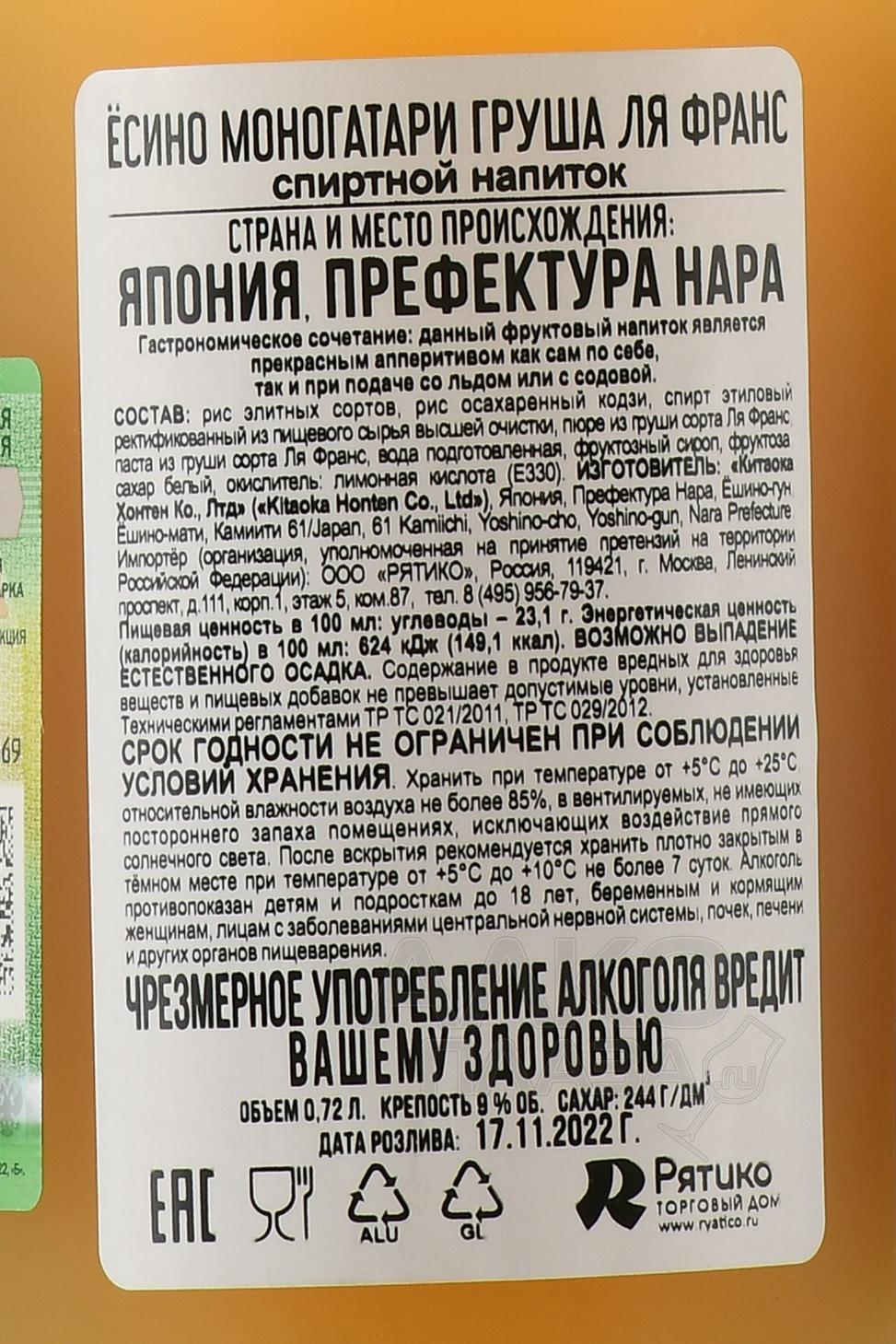 Ликер Ёсино Моноготари Груша Ля Франс 0,72 л — японский десертный алкоголь (сладость равна 244 г/дм³), который выпускают в префектуре Нара. Его поставщик — старинная компания, ведущая историю с XIX века. Основным компонентом девятиградусного напитка является груша сорта La France, обладающая сочной ароматной мякотью и высоким содержанием микроэлементов, в первую очередь калия. Также ликер содержит рис элитных сортов, высококлассный этиловый спирт и фруктозный сироп.