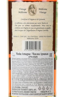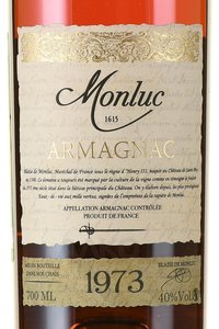 Поместье находится в деревушке Sait-Puy. Его виноградники, занятые белыми сортами Уни Блан, Фоль Бланш и Коломбар, располагаются на невысоких склонах холмов и имеют южную экспозицию. Очень старые лозы растут на глинисто-известняковых почвах. Виноградники почти не подвергаются обработке со стороны человека, что позволяет получать с них максимально натуральное, органическое сырье. Урожаи невелики по объему, но отличаются высоким качеством. Созданные из них дистилляты проходят традиционную выдержку в бочках из гасконского дуба минимум 3 года. Максимальный предел созревания в дубовых бочках — 20-25 лет, однако в линейке бренда есть образцы и с более солидным возрастом — это элитные миллезимы, произведенные в 60-90-х гг. прошлого века. В основной ассортимент входят купажи категорий XO, VSOP, VS. Арманьяк Monluc обладает элегантным, аристократичным и при этом невероятно богатым вкусом, в котором можно различить оттенки дуба, сушеных и вяленых фруктов, смолы, орехов, пряных трав, десертных специй, цедры, лакрицы и кожи. Премиальный напиток часто идет в комплекте с подарочной коробкой, поэтому его можно выбрать на роль оригинального, солидного презента.