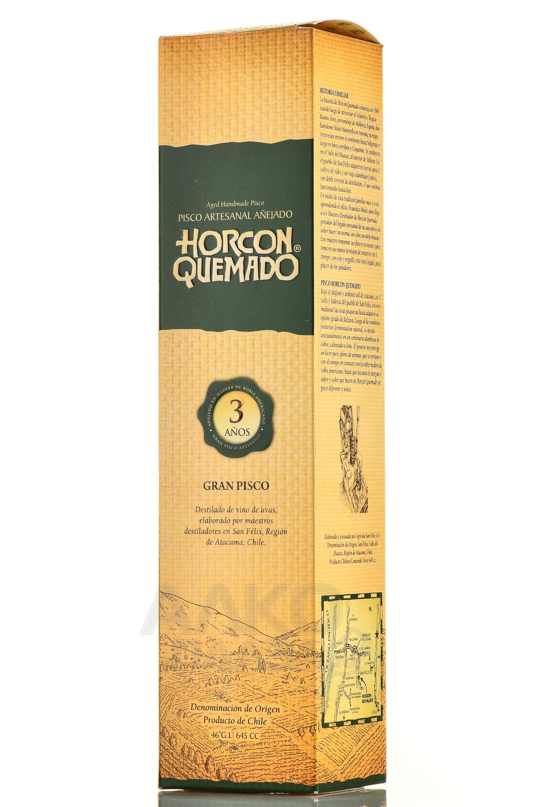 Писко Horcon Quemado Grand Pisco 3 Anos 0,645 л — самобытный чилийский 46-градусный виноградный напиток, состоящий из сусла на базе трех сортов со старинных лоз (возраст достигает 125 лет), которые культивируется в пустыне Атакама. Обработку проходят только ягоды идеальной зрелости с высокой сахаристостью: сначала их ферментируют в бетонных резервуарах, а после полученное таким способом вино дистиллируют в медных колоннах. Выдержку сроком от трех лет проводят в американских дубовых барриках. До бутилирования писко отстаивается где-то два месяца. На реализацию его отправляют в необычных бутылках с бугельными пробками и сопровождают подарочными картонными коробками вытянутой формы.