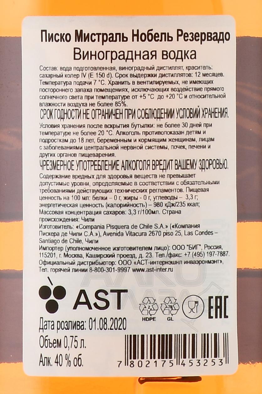 Писко Mistral Nobel Reservado gift box 0,7 л — выдержанный сорт чилийского популярного крепкого спиртного, который является купажом двух видов винограда из Долины Эльки. Перед многоступенчатой обработкой спелые ягоды от делили от стеблей и гребней, а также измельчили с применением ручного труда и оборудования. Сусло, выработанное таким способом, сбраживалось в стальных баках, далее была проведена 12-месячная выдержка писко в американских дубовых бочках первого наполнения. Премиальный натуральный алкоголь реализуется в подарочных упаковках: бутылки дополняют коричневые боксы с красивым дизайнерским оформлением.
