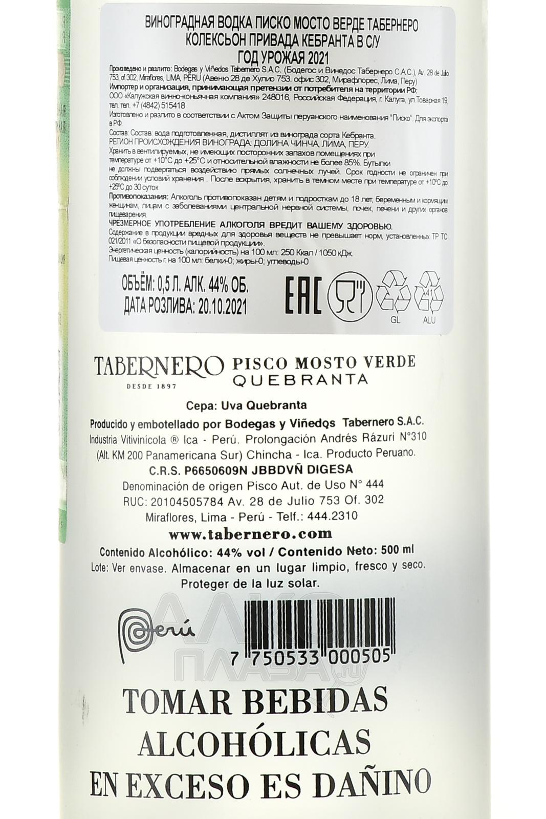 Писко Tabernero Coleccion Privada Mosto Verde Quebranta 0,5 л продается в паре с серебристой изящной тубой, поэтому напиток как нельзя лучше подойдет на роль статусного, роскошного подарка. Эта перуанская вариация 44-градусной крепости на сто процентов состоит из автохтонного винограда Куэбранта, собранного на просторах Долины Чинча. Урожай спрессовали и подвергли ферментации, затем он перегонялся в классических медных устройствах. Этот вид писко — серебряный призер известного конкурса «International Wine Challenge».