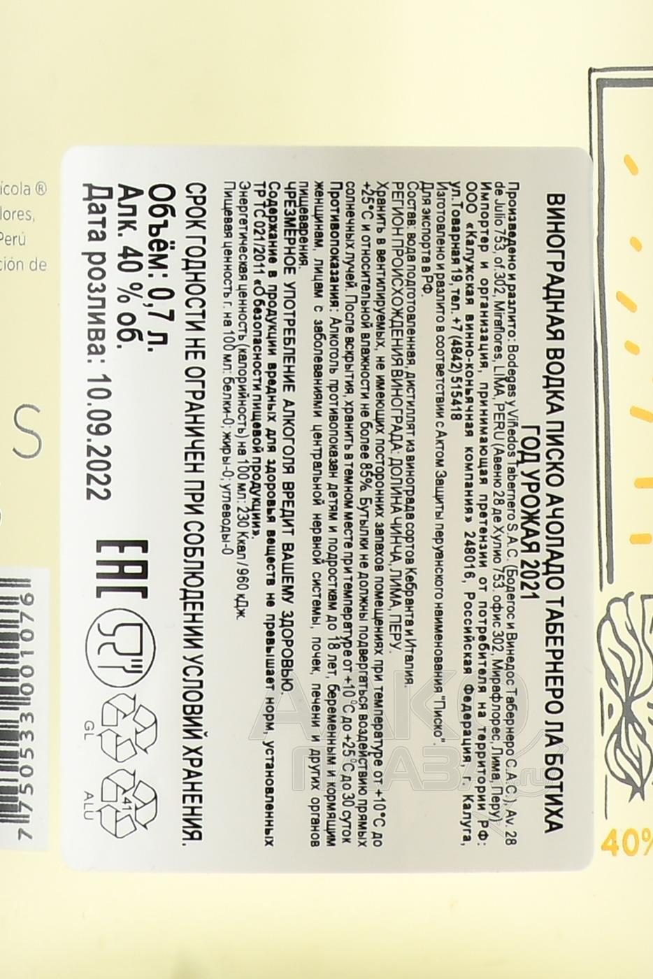 Писко Tabernero La Botija Pisco Acholado 0,7 л объединяет в составе два сорта винограда перуанского происхождения, выращенных на плантациях Долины Чинча в регионе Лиму. Сбор урожая осуществился в пределах 2021 года, когда ягоды достигли оптимальной спелости и стали ароматными, сочными. Сырье ферментировали без применения искусственных добавок в чанах, затем полученное сусло отправили для дистилляции в кубы из меди. После фильтрации 40-градусный писко разлили по симпатичным бутылкам из матового стекла.