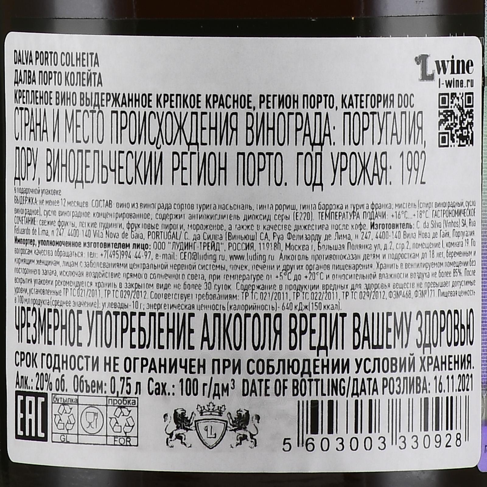 Портвейн красный Dalva Porto Colheita 1992 г. 0,75 л в д/у относится к винтажным сортам национального португальского напитка. Он сделан из урожаев местного винограда, собранных в одном и том же году на плантациях региона Дору. Вино провело в дубовых бочках не менее 7 лет, благодаря чему приобрело сбалансированный и многогранный профиль. В деревянном боксе купаж послужит солидным презентом.