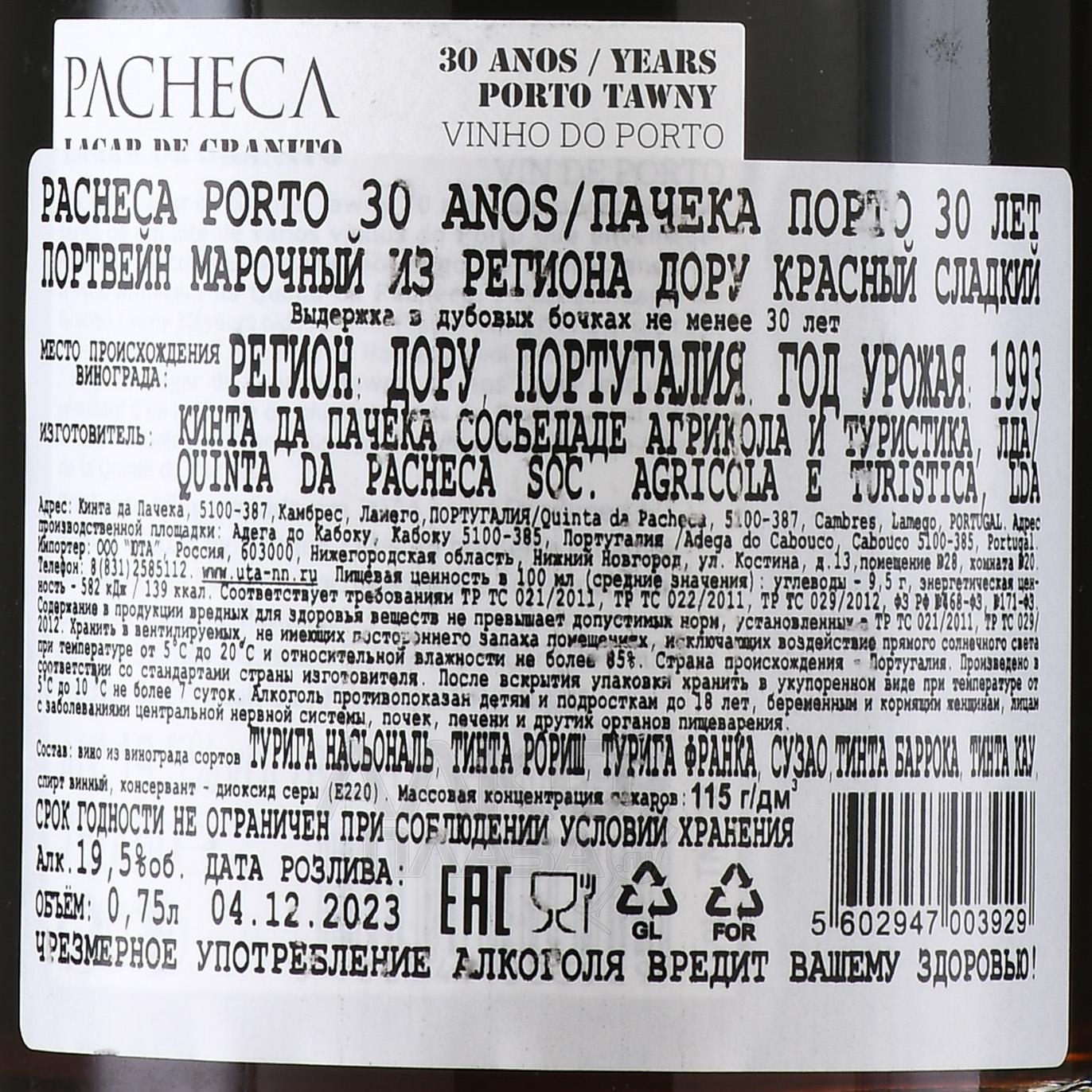 Pacheca Lagar de Granito Porto 30 Anos - портвейн Пачека Лагар де Гранито Порто 30 лет 0.75 л красный сладкий в тубе