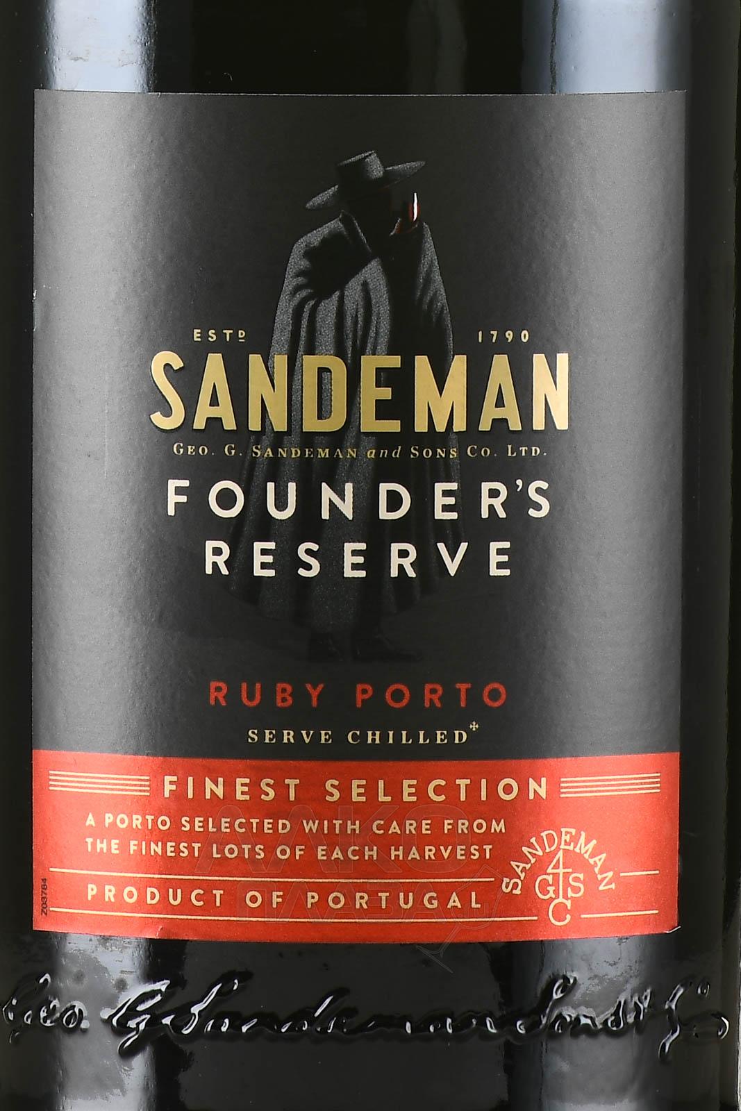 Портвейн Sandeman Founders Reserve Ruby Porto на основе комплекса красных автохтонных сортов винограда португальской Долины Дору, собранных во второй половине сентября, контролируется по месту происхождения. 20-градусная вариация с содержанием сахара 100 г/л ферментировалась в емкостях из нержавеющей стали при термоконтроле и выдерживалась в дубовых барриках 4 года и более.