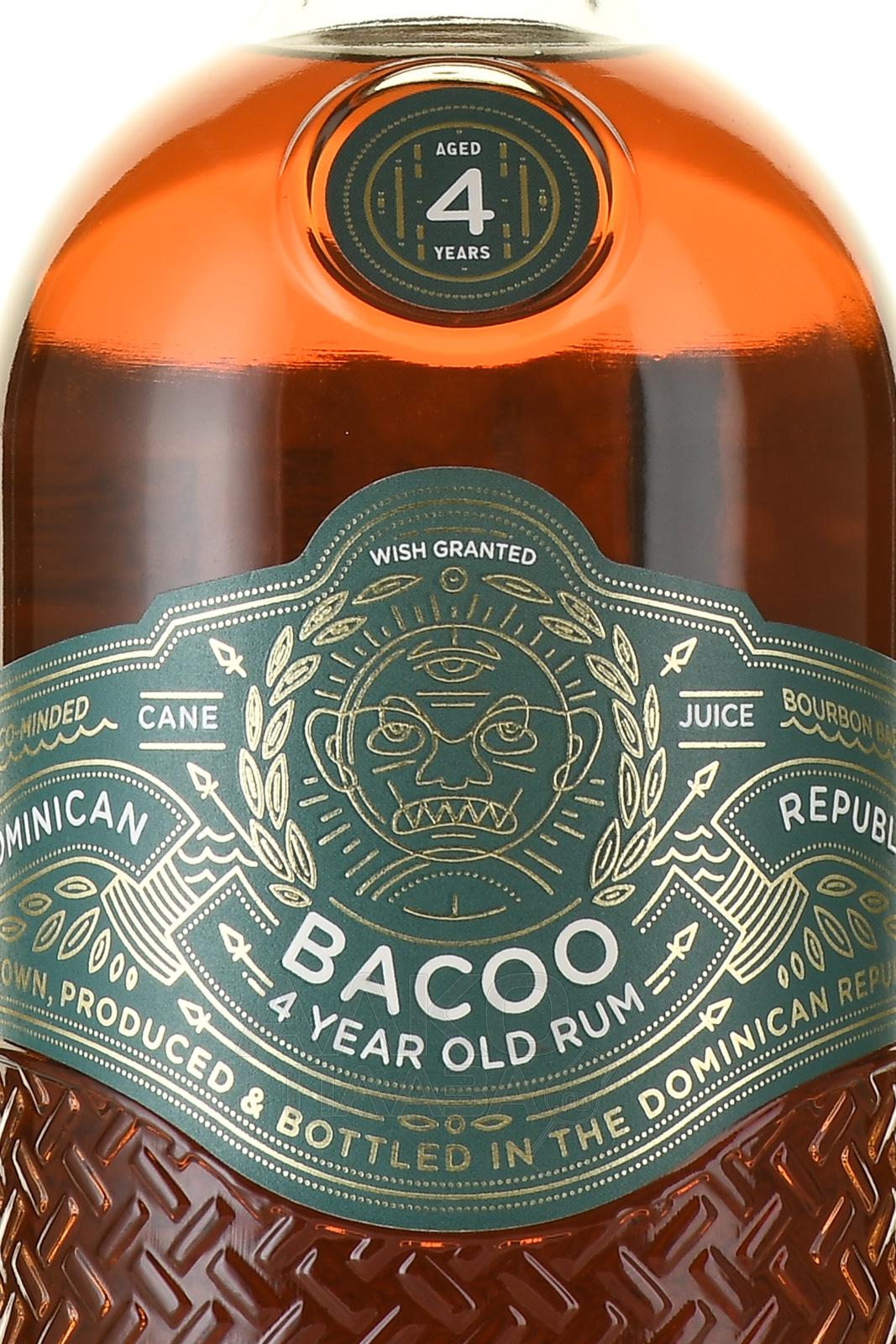 Ром Bacoo 4 года 0,7 л — темный доминиканский сорт, который создается в рамках технологии полного цикла на Карибах. В одном месте выращивают сахарный тростник, получают из него мелассу и перегоняют ее в дистиллят, который затем выдерживается в бурбонных обожженных бочках первого наполнения. Ром купажируют местной деминерализованной водой до крепости 40% и бутилируют на заводе в муниципалитете San Pedro de Macoris. Алкоголь поставляется в эффектной бутылке с рельефными узорами и изображением доминиканского божества Баку.