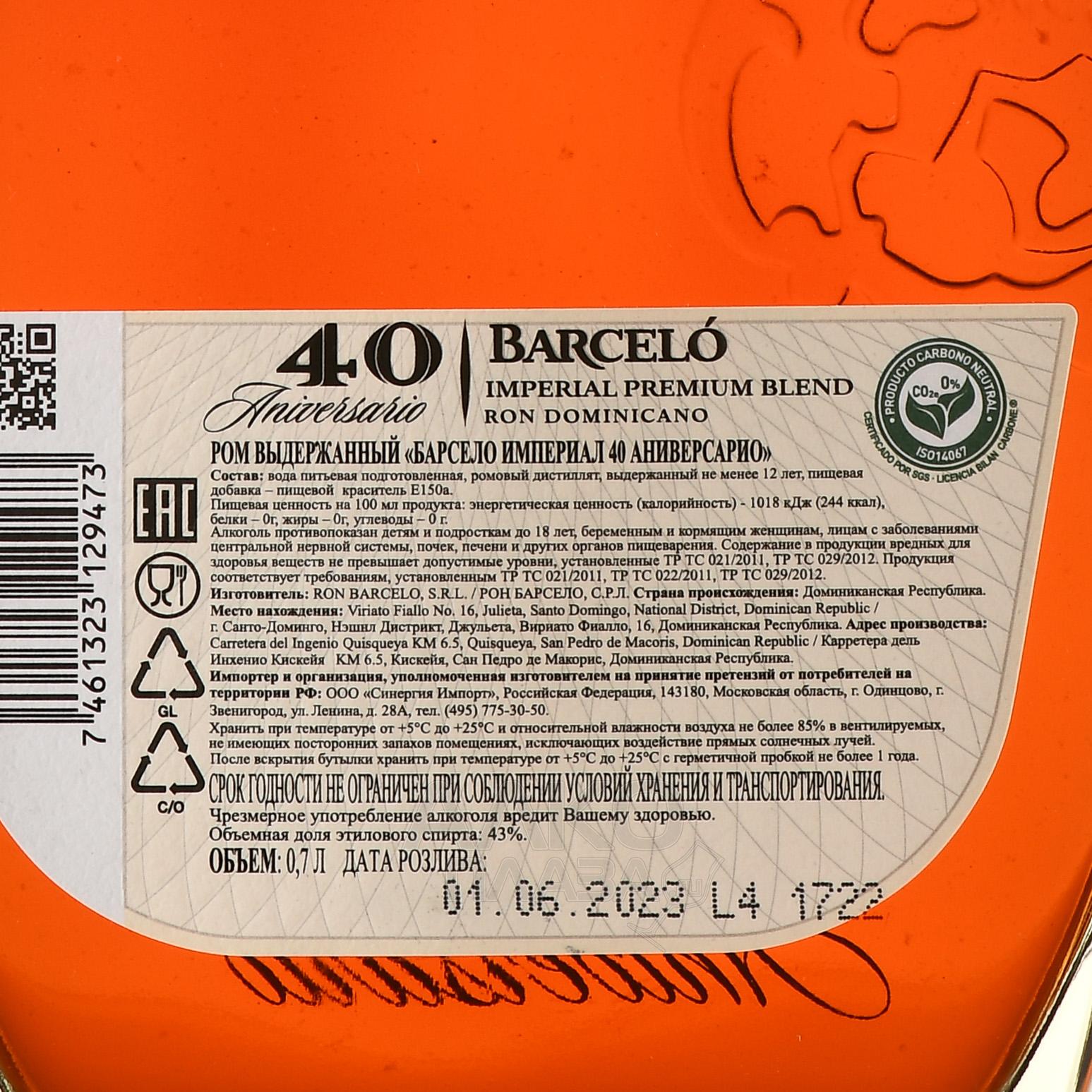 Ром Barcelo Imperial Premium 40 Aniversario 0,75 л в тубе посвящен 40-летнему юбилею со дня дебюта доминиканского бренда Барсело Империал. В купаж вошли резервные спирты из лучших бочек, выдержанные 12-30 лет. Они созревали в американском и французском дубе с разной степенью обжига и были тщательно отобраны мастером погреба. Составленный бленд «отдыхал» в нейтральных стальных резервуарах, чтобы все компоненты ассимилировались и гармонично перемешались. Премиальный спецрелиз был разлит в бутылки при крепости 43% в июне 2023 года. Он получил золотую медаль на конкурсе London Spirits Competition и был выпущен в стильном гифт-боксе. Сложно представить что-то более подходящее для оригинального презента ценителю.