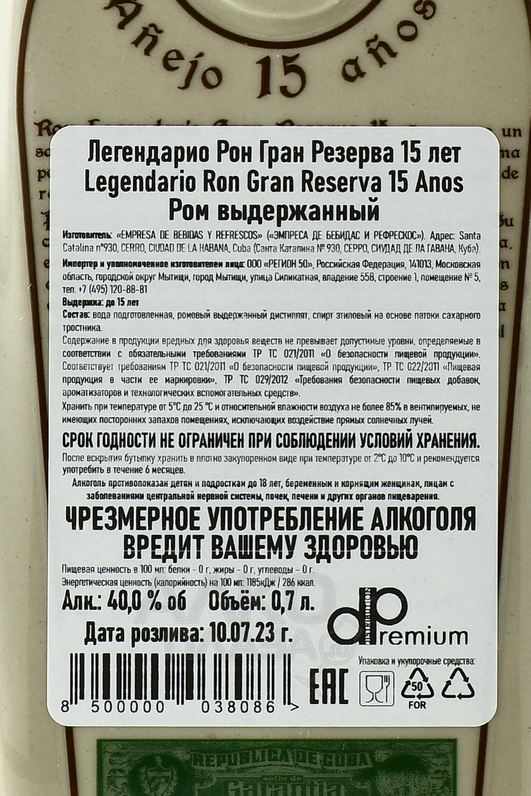 Legendario Gran Reserva 15 years ром высочайшего уровня выдерживается 15 лет в дубовых бочках, что придаёт напитку глубину цвета, насыщенный аромат спелых тропических плодов, ванили, острого красного перца, который так же ощущается и во вкусе, но это не единственное чем он примечателен, так же стоит отметить дизайн бутылки, которая выполнена из керамики. Замечательный выбор в качестве подарка, который украсит домашний бар.