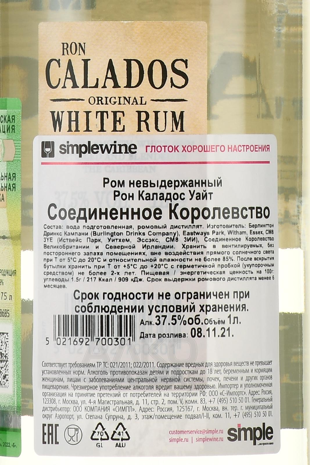 Rum Ron Calados white белый ром с тонким ароматом кокосового молока, банана и лёгкой ванильностью. Вкус мягкий с сладким карамельным привкусом. Употреблять лучше всего в составе коктейлей, либо с безалкогольными напитками.
