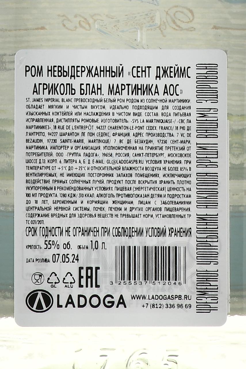 Ром Saint James Agricole Blanc Martinique 1 л — белый сельскохозяйственный сорт с острова Мартиника. Для его производства используют свежий сок из сахарного тростника с местных плантаций. Его ферментируют специальным образом, дистилляция происходит в традиционных креольских колоннах, благодаря чему напиток приобретает особый, характерный стиль. Уникальность этого рома в строгом соблюдении стандартов защищённого наименования происхождения (AOC), гарантирующего подлинность и высокое качество.