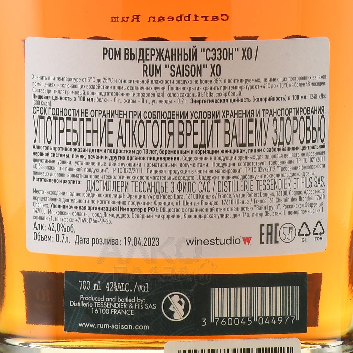 Ром Saison XO 0,7 л в п/у представляет собой эксклюзивный бленд из дистиллятов с Ямайки, Барбадоса и Тринидада. Они выдерживались не менее 10 лет в тщательно отобранных американских бочках из белого дуба. Далее их переправили во Францию, где купаж составлял именитый мастер Жером Тессендье. Бленд прошел довыдержку в старых бочках из-под коньяка. Ром получил золотую награду на конкурсе San Francisco World Spirits Competition.