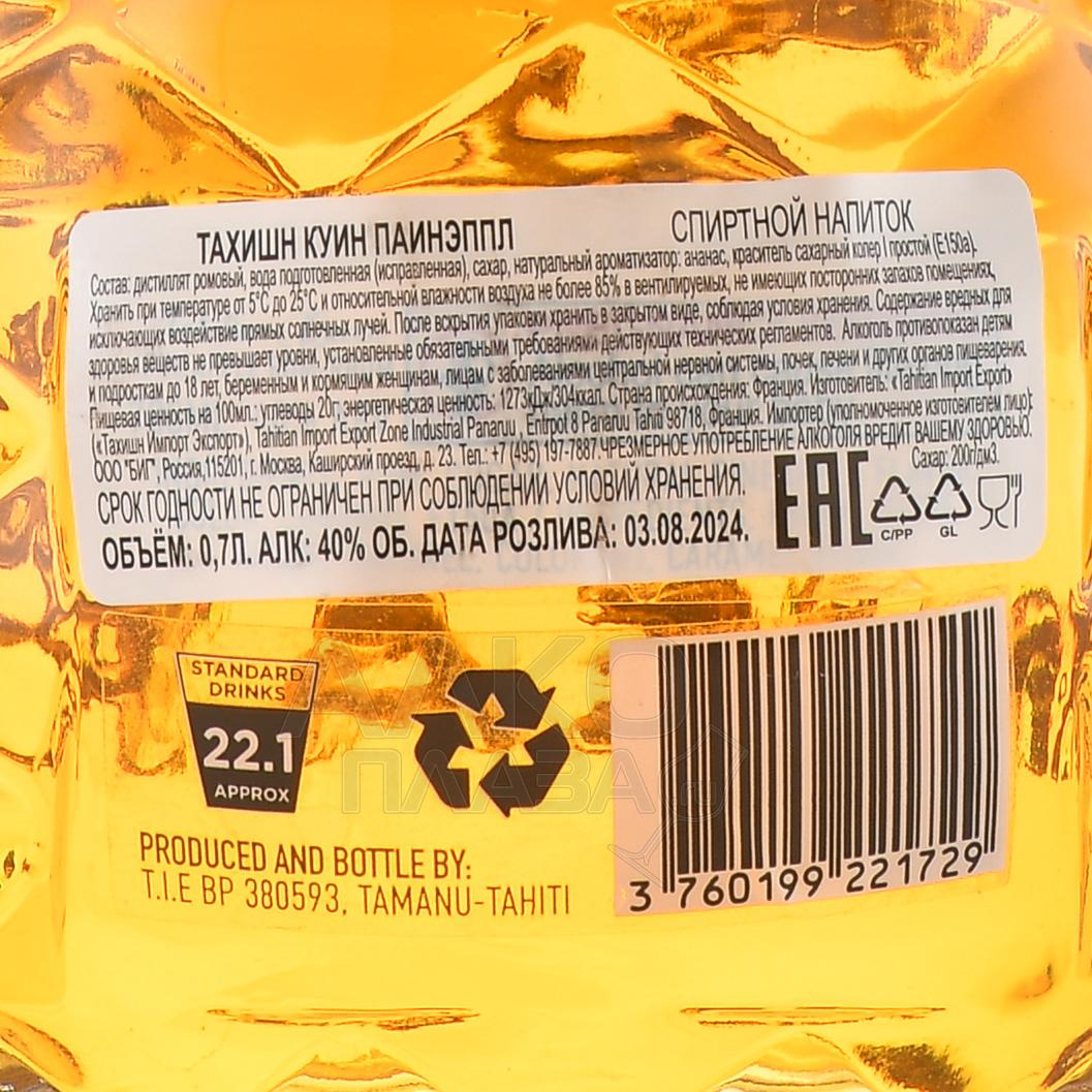 Ром Tahitian Queen Pineapple Rum 0,7 л — натуральный ароматизированный сорт алкоголя с острова Таити, произведенный в лучших местных традициях. В нем содержатся отборные выдержанные дистилляты тропического сахарного тростника, проведшие от одного до трех лет в ценных бочках из-под американского бурбона. Для того чтобы сделать вкусовые тона необычными и запоминающимися, в напиток добавили немного натурального ананасового экстракта. Роскошный ром разлит по оригинальным графинам, напоминающим ананасы.