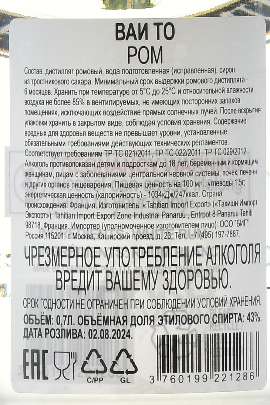 Ром Vai To Rum 0,7 л — молодая разновидность популярного напитка, который состоит из сахарного тростника, выращенного в уникальном климате с тропическими проявлениями. Урожай собрали на острове Тахаа, находящемся в двухстах километрах от Таити. Ферментация сусла проходила с добавление родниковой воды и местных дрожжевых штаммов, затем спиртное дистиллировали в двух небольших колоннах. Ром выдерживался в стальных баках около полугода.