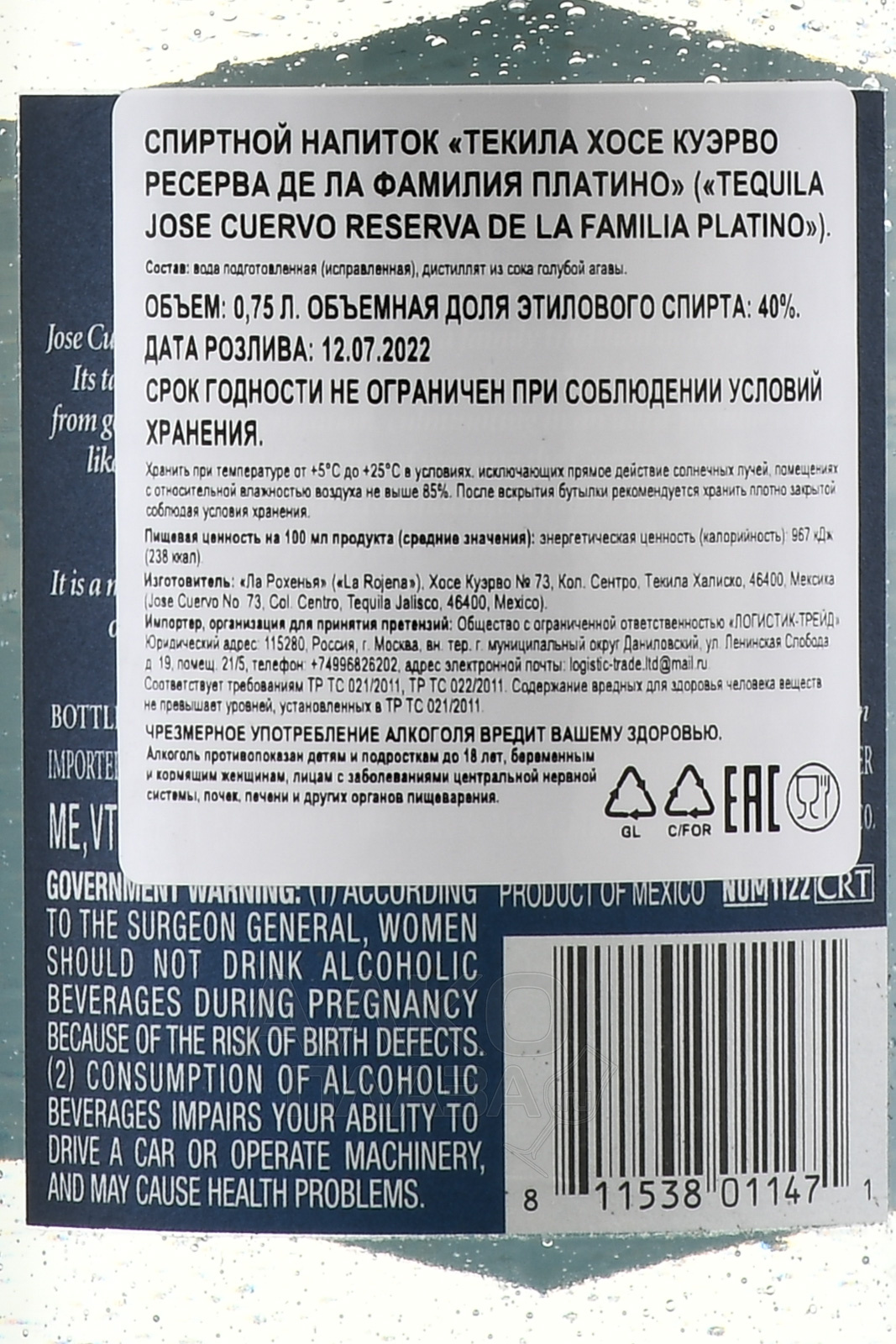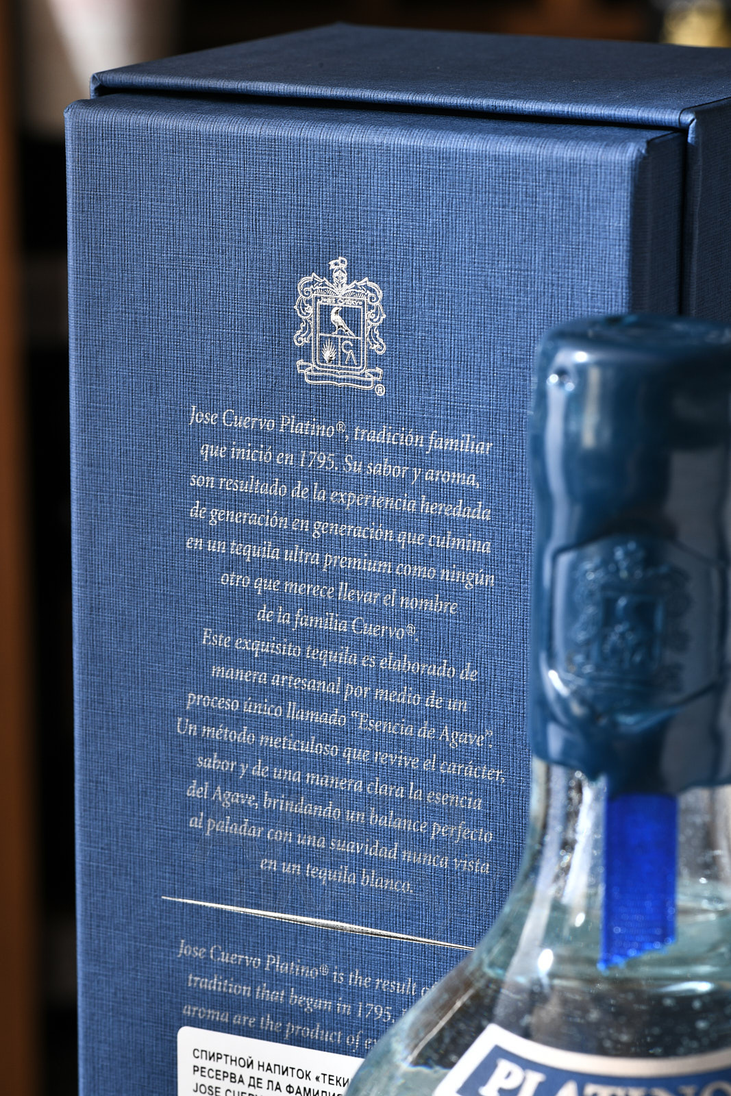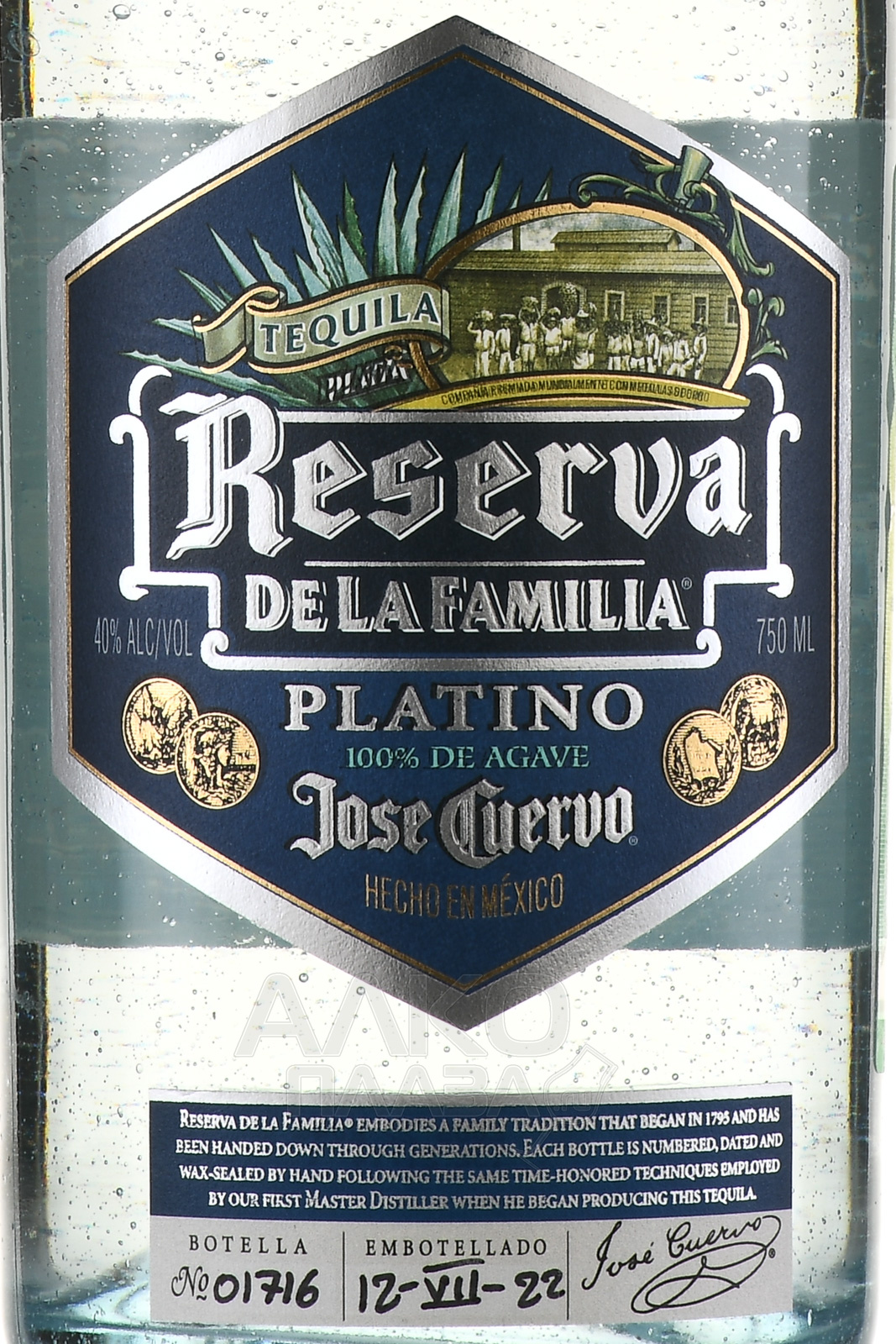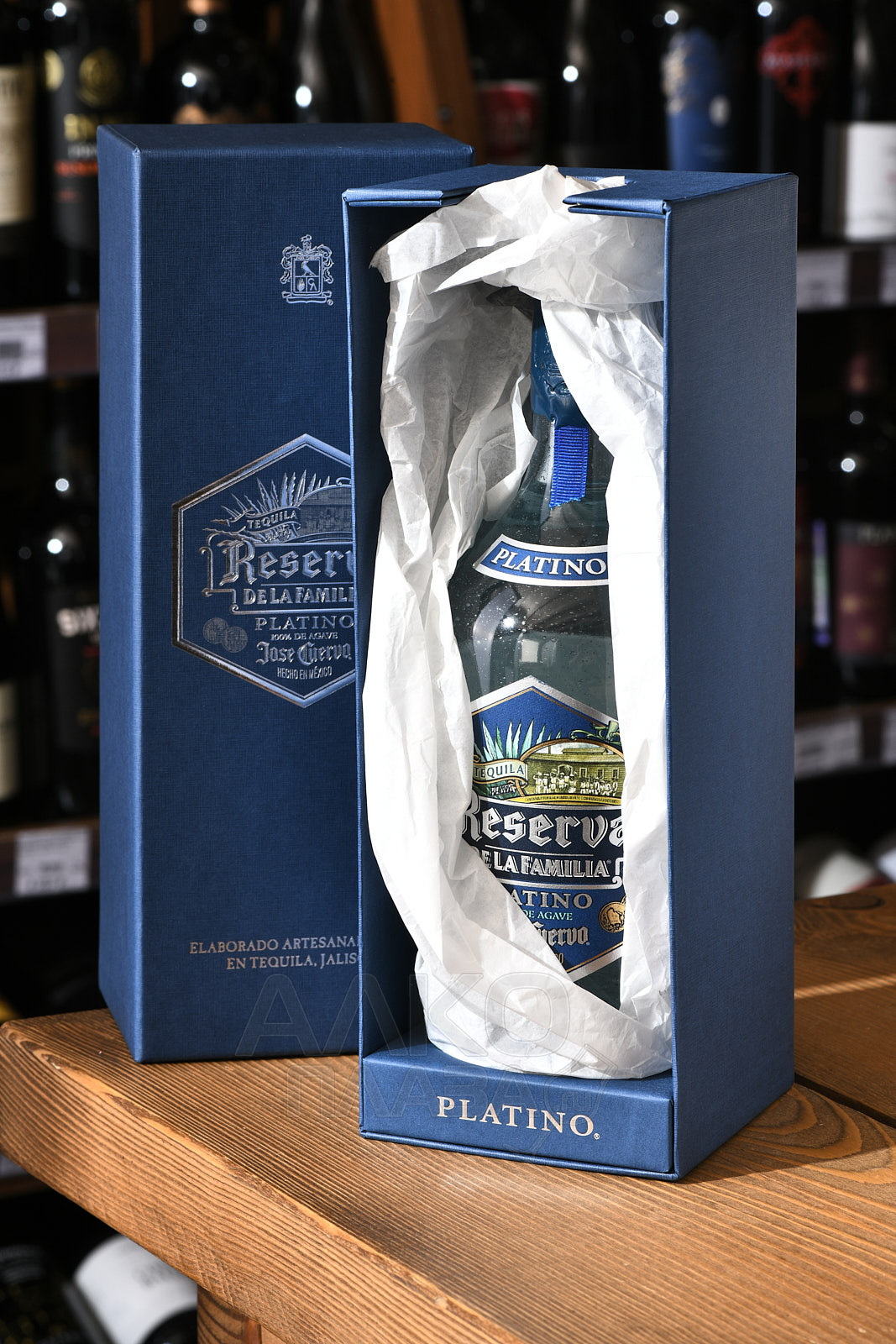 Jose Cuervo Platino Reserva de la Familia - премиальная текила приготовленная на 100% из голубой агавы из штата Халиско. Производство включает в себя специальный отбор лучших частей агавы, что концентрирует и раскрывает вкус напитка. Готовая текила разливается в пронумерованные бутылки и упаковывается в подарочную коробку.