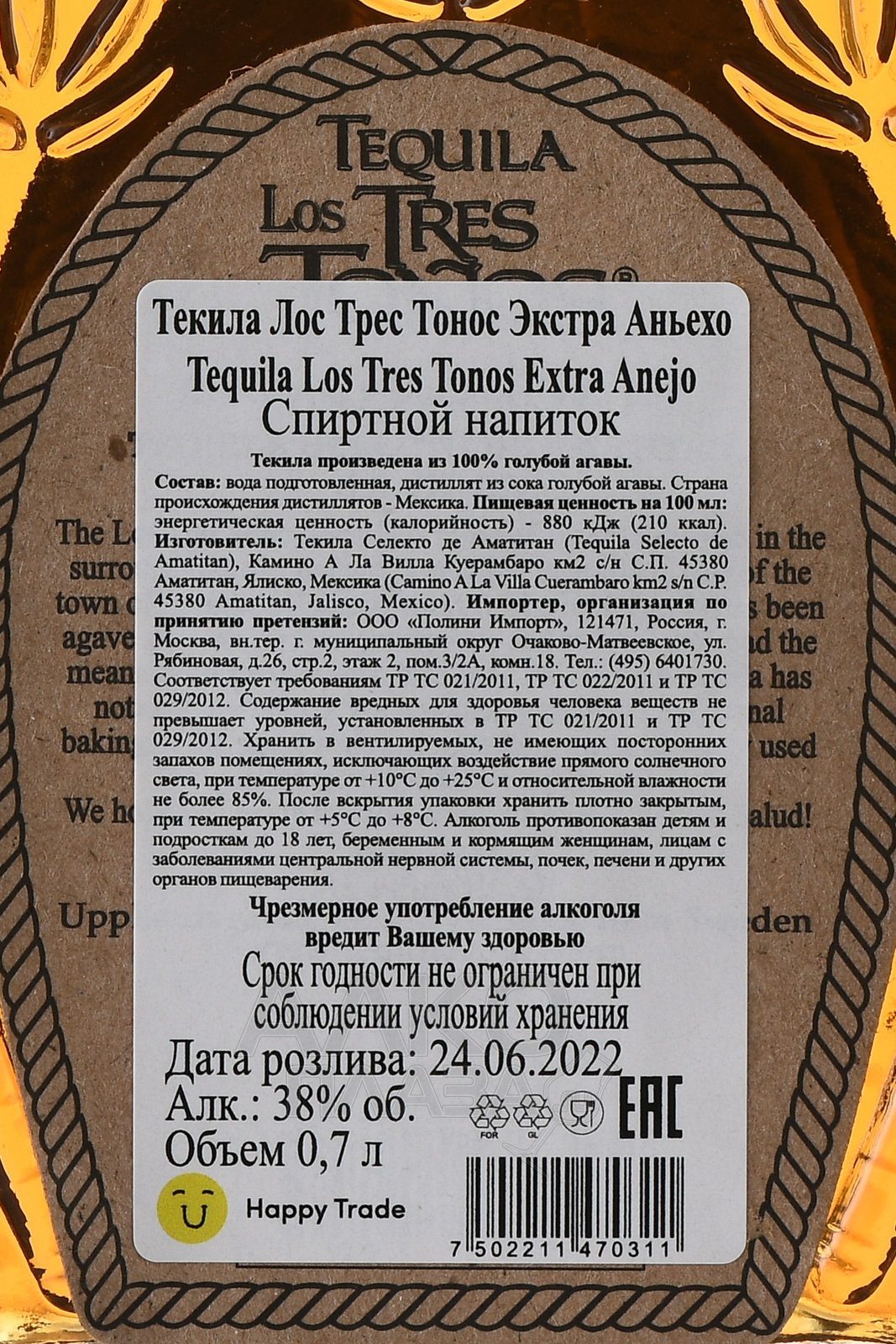 Los Tres Tonos Extra Anejo - текила Лос Трес Тонос Экстра Аньехо 0.7 л