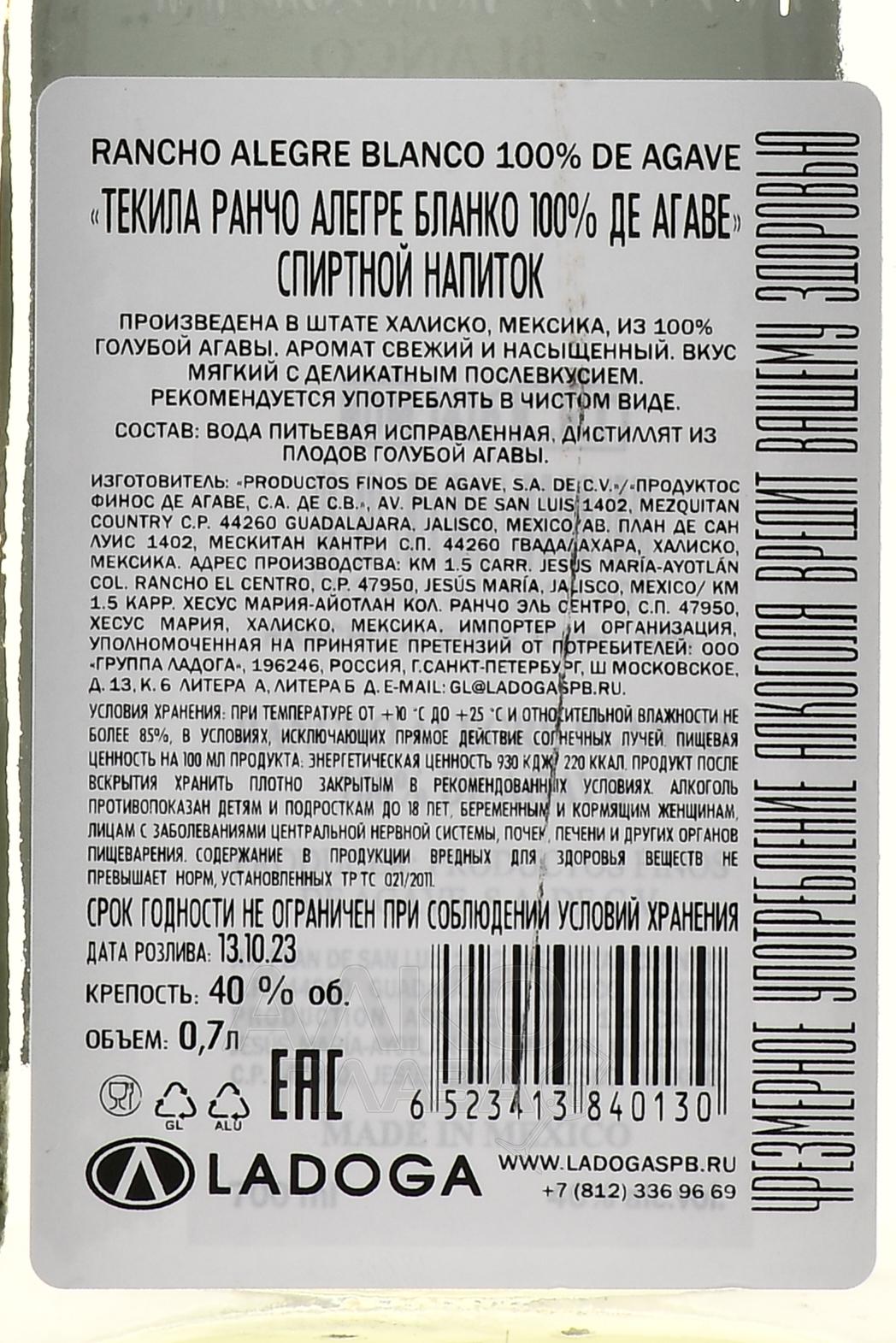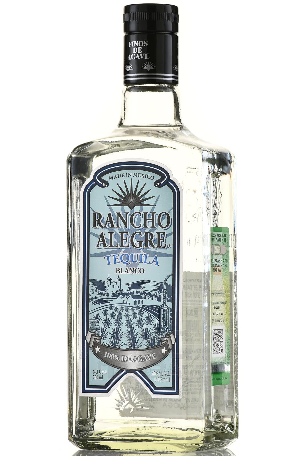 Текила Rancho Alegre Blanco 0,7 л — популярный сорт мексиканского национального алкоголя, который предлагается без выдержки. Местность производства — штат Халиско, где на глинистых почвах провели сбор урожая сырья для напитка (зрелой голубой агавы), а также выполнили полный цикл его обработки. Свежий сок, отжатый с применением ручного труда и классического оборудования, сбраживался и дважды перегонялся, после чего текилу отфильтровали и разлили по фирменным стеклянным бутылкам. В 2015 году этот алкоголь получил заслуженную золотую медаль на знаменитом конкурсе «San Fransico World Spirits Competition».