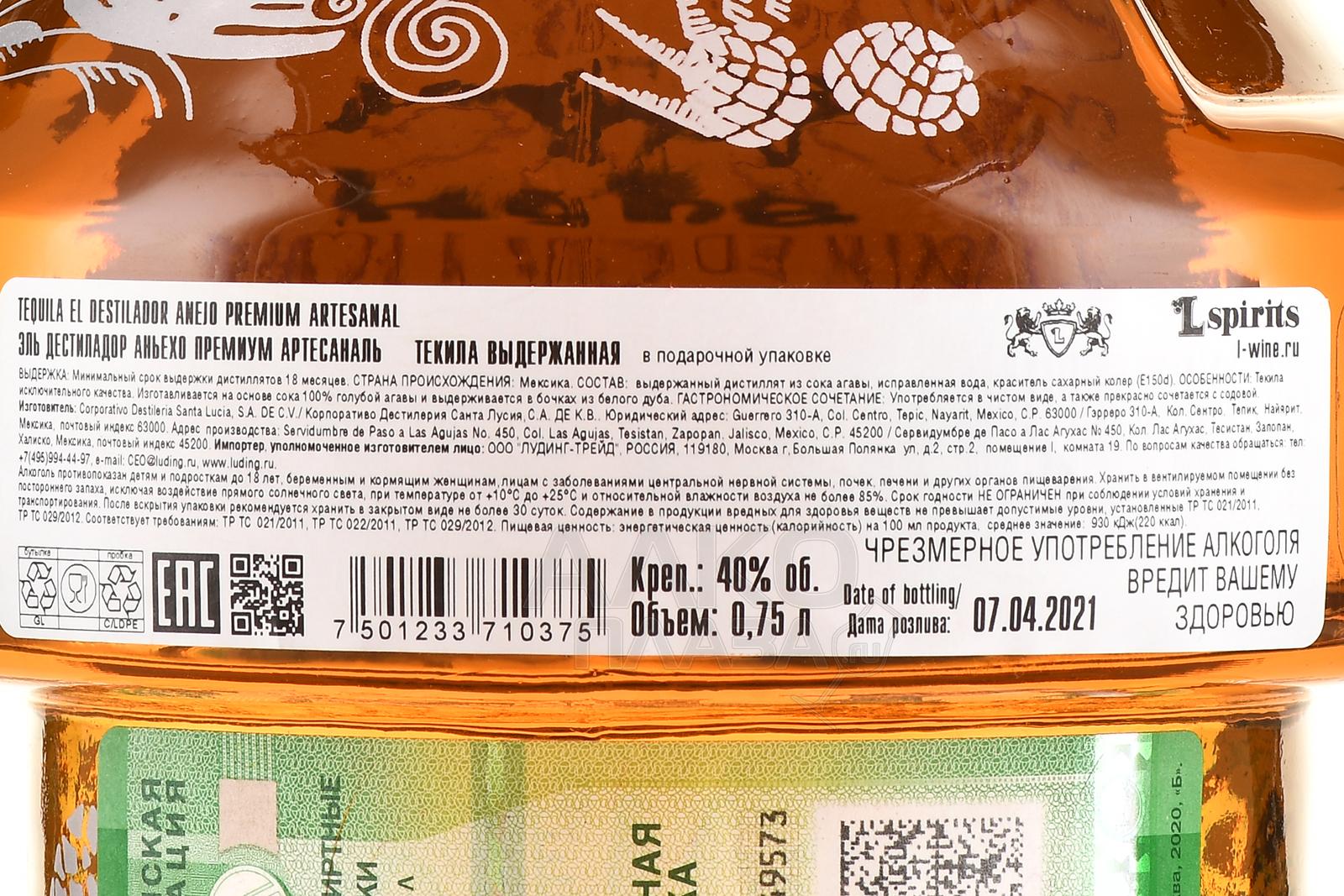 Текила El Destilador Anejo Premium Artesanal от одноименной компании из Мексики предлагается в стильной фигурной бутылке сувенирного вида, идущей в комплекте с красным картонным гифт-боксом. Продукт на основе дистиллятов голубой агавы с уровнем спиртуозности 40% вызревал в дубовых барриках около двух лет.