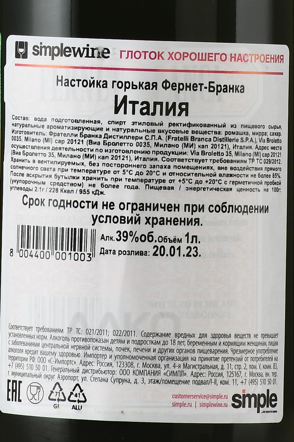 Настойка Fernet Branca 1 л в большой бутылке из зеленого стекла, оснащенной многоразовой удобной винтовой крышкой, произвели в Италии без использования добавок искусственного происхождения. Этот душистый алкоголь 39-градусной крепости представляет собой смесь натуральных ингредиентов (в том числе цветков ромашки, сахара, мирры), настоянных на качественной этиловом спирте, полученном методом ректификации. Ароматная итальянская настойка около 12 месяцев выдерживалась в дубовых барриках.