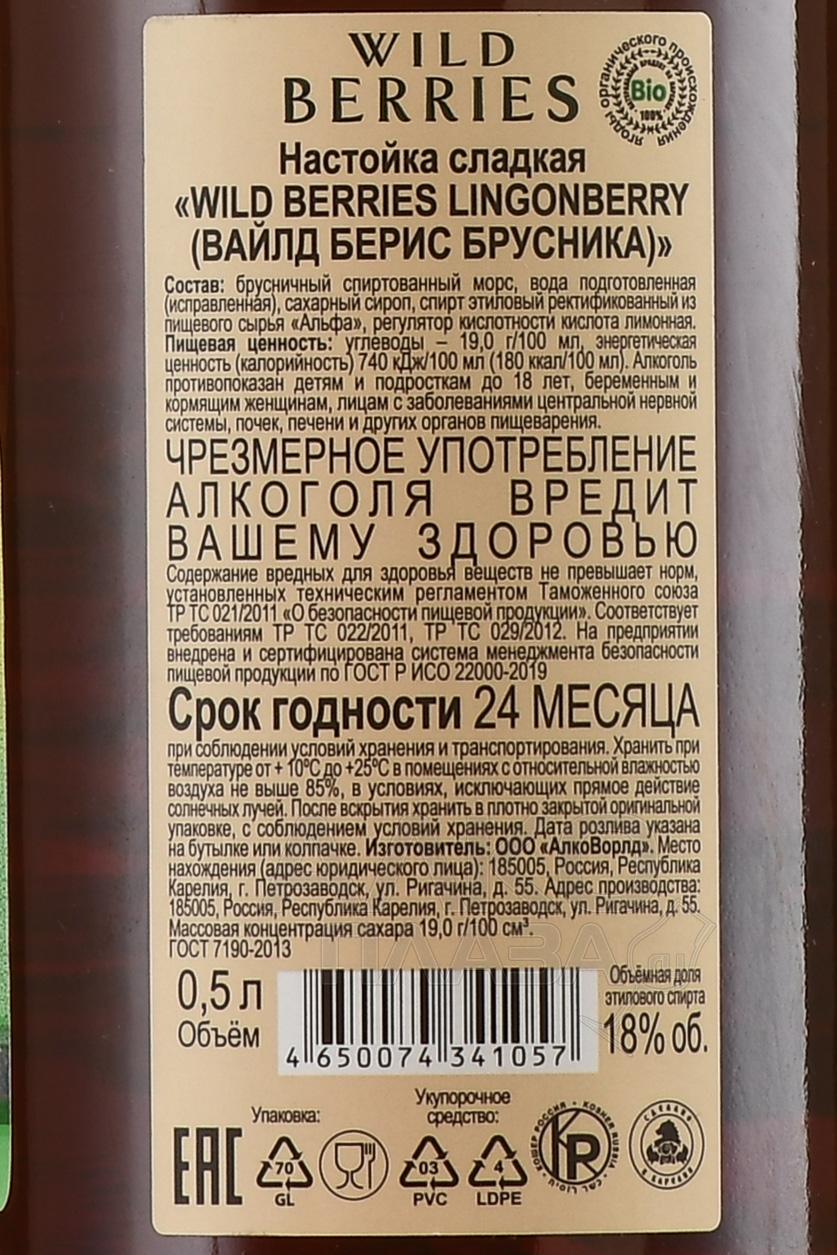 Настойка Wild Berries Lingonberry 0,5 л — сладкий алкогольный напиток на основе высококачественного спирта класса «Альфа», брусничного морса, вымоченного в дистилляте, и сахарного сиропа. Выпуск этого напитка осуществляется предприятием из Карелии, города Петрозаводска. Благодаря присутствию в составе натуральных экологичных ингредиентов из этой заповедной лесистой местности, настойка имеет органический сертификат. Ее крепость средняя — 18 градусов.