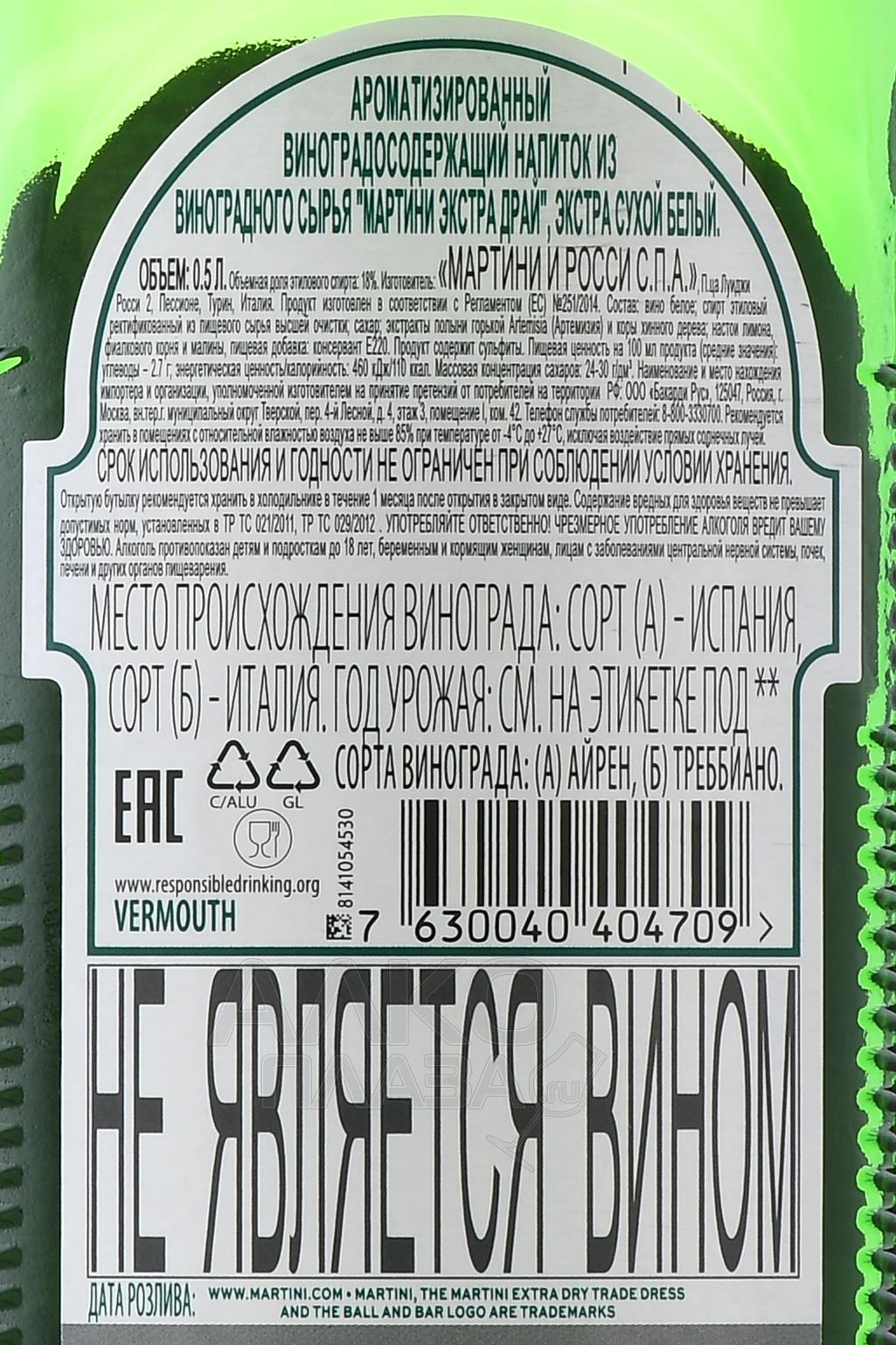 Martini Extra Dry — вермут с ярким, выраженным ягодно-фруктовым ароматом с оттенками малины, цитрусов. Вкус напитка сухой, но приятный, освежающий. Горчинка в послевкусие добавляет приятную пикантность. Подавать охлаждённым с кубиками льда, дольками лимона или лайма, так же прекрасно подходит для приготовления коктейлей.