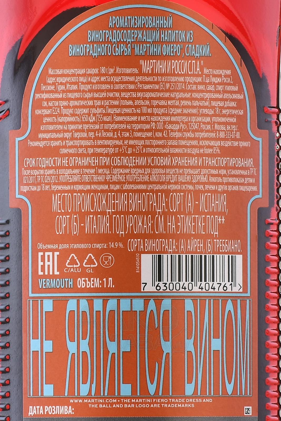 Martini Fiero — яркий, насыщенный, сочный вермут с оттенами цитрусовых фруктов (грейпфрут, апельсин), ванильными и медовыми тонами. Во вкусе чувствуется приятная сладость сочетающаяся с фруктовой свежестью, пряными нотами и оттенками мёда. Вермут Мартини "Фиеро" отлично подходит для приготовления коктейлей, прекрасен в сочетании с тоником.
