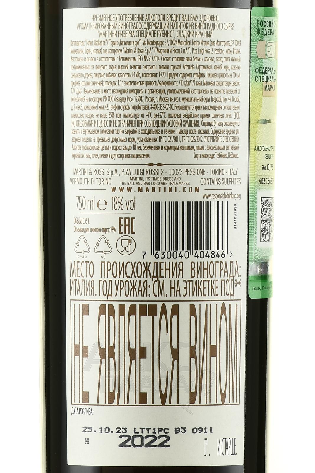 Вермут Martini Riserva Speciale Rubino 0,75 л – это насыщенный и сложный купаж, созданный на основе полуторавекового аутентичного рецепта. Щедрый букет напитка обуславливает множество ботанических ингредиентов, зачастую – довольно редких, таких, как сандал, например. Также в бленд включены три вида полыни: Absinthium, Pontica и Vulgaris тогда, как обычно изготовители используют только два сорта этого растения. Аромата вариации добавляют отборные красные вина Пьемонта и Ланге. До смешивания растительные экстракты выдерживаются более двух месяцев в чанах из дуба Piemontese Tino, что в прошлом было распространенной практикой, а в современном производстве практически не применяется.