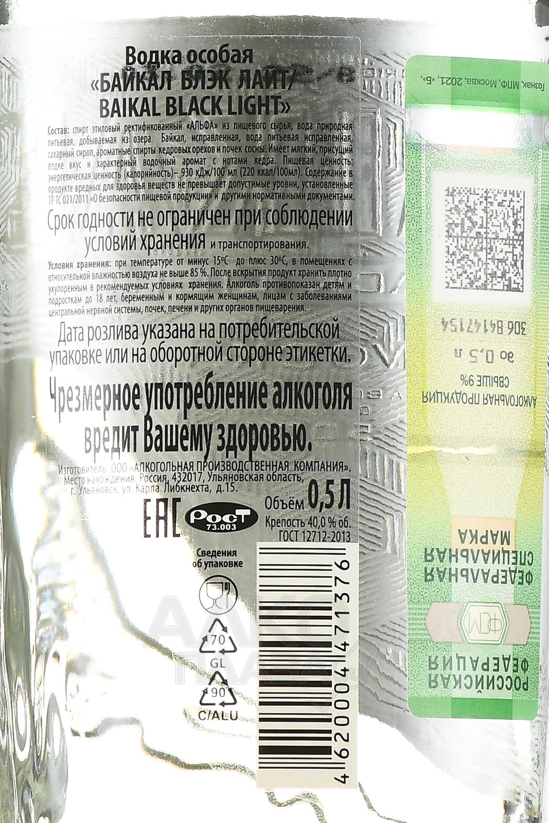 Baikal Black Light - водка Байкал Блэк Лайт 0.5 л