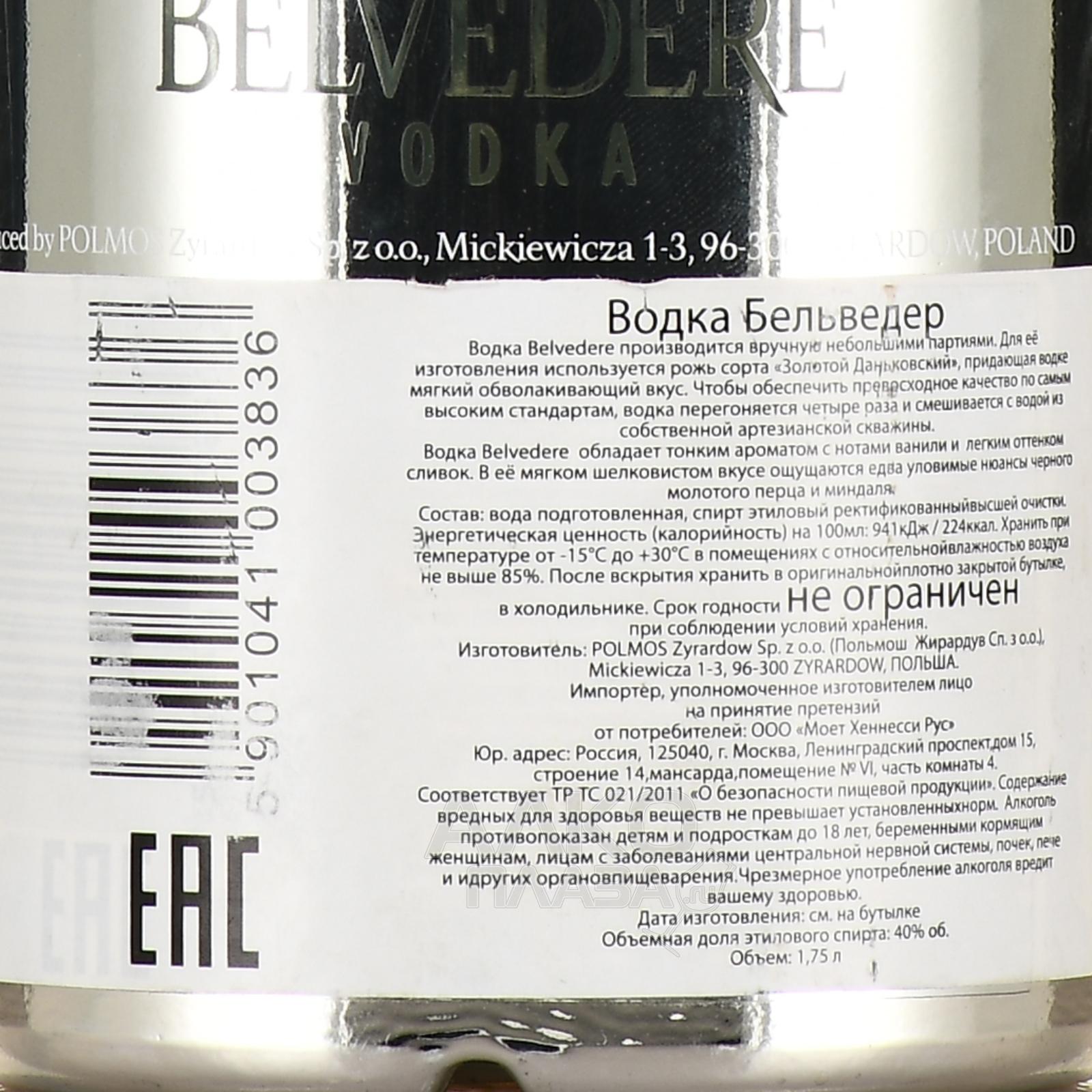 Водка Belvedere 1.75 л – польский суперпремиальный крепкий алкоголь, представленный в увеличенном формате. Для его производства используют отборную рожь сорта Dankowskie, выращенную на равнинах Мазовии и придающую напитку уникальный мягкий вкус. Кристально чистая вода из артезианских скважин, принадлежащих компании, прошла одиннадцать степеней очистки. Водка Бельведер подвергается процессу четырехкратной дистилляции, что позволяет получить продукт высочайшего качества, который способен конкурировать с известнейшими мировыми производителями. Ее разливают в эксклюзивно оформленные стеклянные бутылки, декорированные вручную, и укупоривают натуральной пробкой, которую закупают в Португалии.