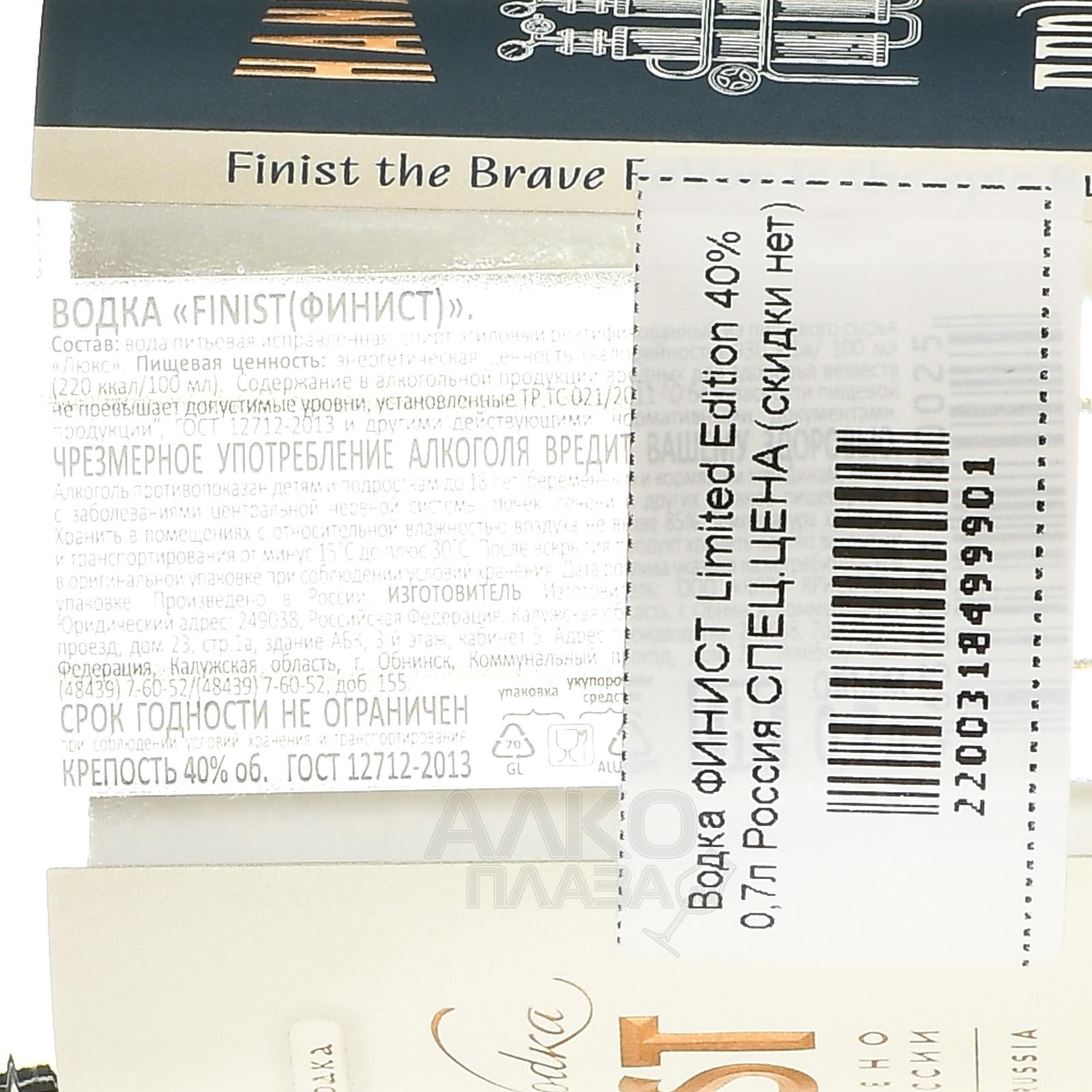 Водка Finist Limited Edition 0,7 л — крафтовый спиртной напиток, который создается из лучших, тщательно отобранных ингредиентов. Основой является спирт категории «Люкс» из алтайской пшеницы. Для купажирования использовалась вода из заповедных природных источников. Водка была очищена с помощью уникальной авторской технологии Silver Horn. Производитель изменил конфигурацию фильтров таким образом, чтобы сделать алкоголь максимально мягким и чистым, не нарушая при этом классическую вкусоароматическую палитру. Без выдержки и отдыха водка сразу разливается в бутылки, которые закупориваются пробками из биоматериалов. Было выпущено всего 2502 экземпляра премиального алкоголя. Каждая бутылка имеет индивидуальный номер.