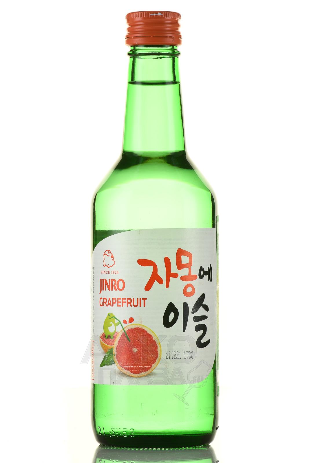 Спиртной напиток Jinro Grapefruit Soju 0.36 л — особый сорт соджу с грейпфрутовым ароматом. Это популярный в Южной Корее алкоголь, обладающий аутентичным профилем и изготавливающийся по уникальной рецептуре. В роли базового компонента используется ректификованный спирт из зерновых культур, который 3 раза пропускают через бамбуковый уголь и сильно разводят водой. В соджу из специальной фруктовой линейки бренда Джинро добавляются сироп и цитрусовый аромат. Напиток имеет крепость 13% и поставляется в небольших бутылочках из прозрачного зеленого стекла.