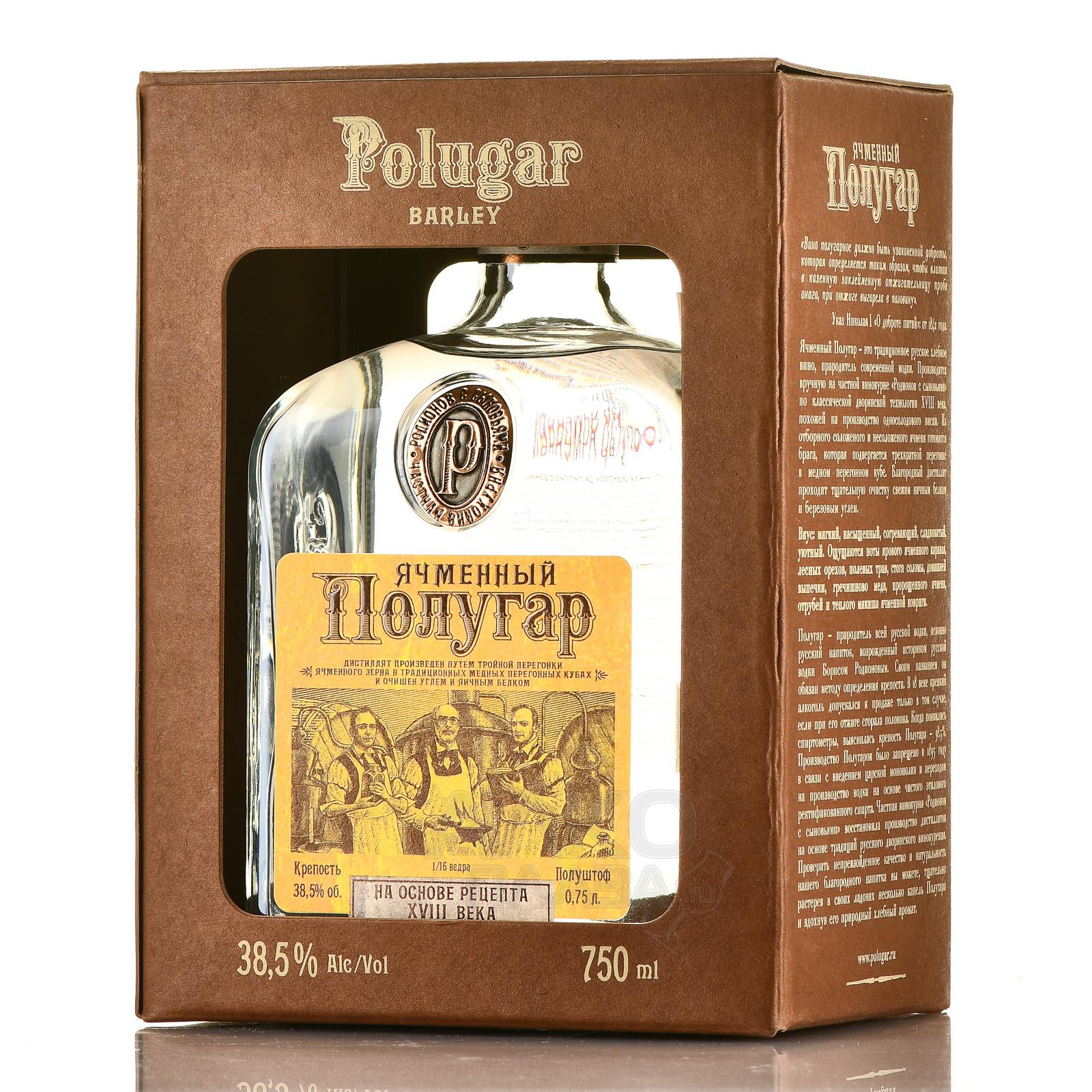 Полугар Ячменный 0.75 л в п/у — современная интерпретация традиционного русского хлебного вина, которое стало предшественником водки. Процесс изготовления основан на оригинальной рецептуре XVIII века, который удалось восставить по старинным книгам. Сусло из ячменного зерна и солода перегоняется три раза в медных колоннах с отсечением «хвостов» и «голов». Спирт очищается с помощью яичного белка и березового угля. Напиток разбавляется питьевой водой до крепости 38,5%, разливается в бутылки формата «русский полуштоф» и поступает в продажу в стильной подарочной упаковке. Его стоит выбрать на роль презента для ценителей необычного традиционного алкоголя.