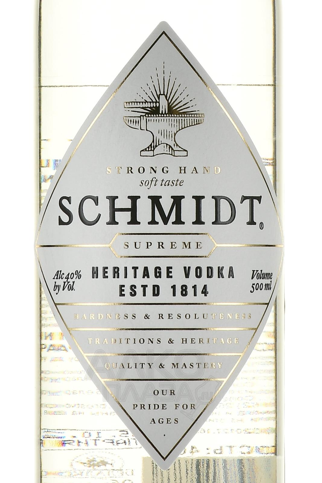 Водка Schmidt Supreme 0,5 л изготавливается по эксклюзивной технологии, в основу которой легли традиции семьи немецких кузнецов Шмидт. Выходцы из Германии переселились в Белоруссию почти 200 лет назад. Ремесленники работали, следуя четким принципам, которые размещены на этикетке премиального алкоголя: твердость, решительность, традиции, наследие, качество и мастерство. Эти постулаты взял на вооружение потомок Артур Шмидт, который наладил промышленное производство алкоголя в США и основал собственную компанию Shmidt Spirits. По ее лицензии в белорусском городе Бресте был начат выпуск водки Шмидт Суприм. Она изготавливается при тщательном контроле. Основным ингредиентом стал ректификованный люксовый спирт из пшеницы. Также используется вода из артезианской скважины, имеющей глубину свыше 200 м. Неповторимый характер водки формируется за счет применения жемчужной фильтрации — это ноу-хау не имеет аналогов.