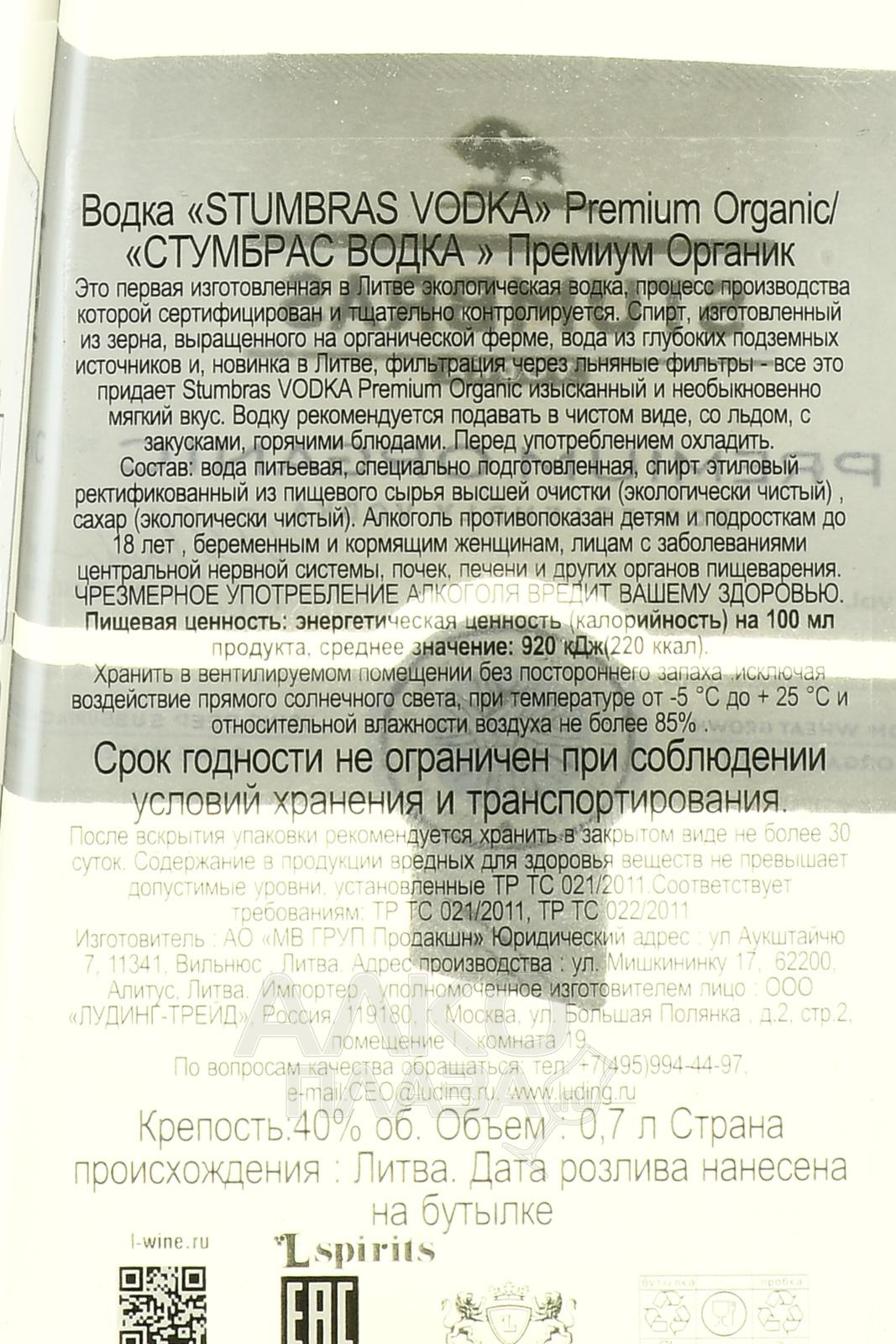 Stumbras Premium Organic - водка Стумбрас Премиум Органик 0.7 л
