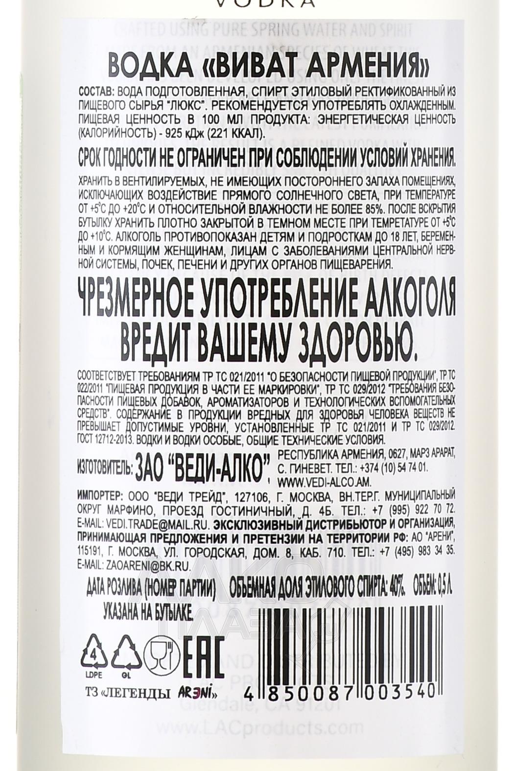 Водка Vivat Armenia 0,5 л создана на основе спирта «Люкс», полученного из отборного зерна высшего качества. Каждая партия напитка проходит тройную дистилляцию, а затем – угольную фильтрацию для удаления примесей. При изготовлении используется артезианская вода, добытая с глубины 150 метров, а различные улучшители вкуса не применяются. Разработка уникального дизайна этикетки велась почти полгода. Ежемесячно выпускается порядка 50 000 бутылок, каждая из них проходит 12 этапов контроля качества, а на выходе снабжается серийным номером, подтверждающим подлинность.