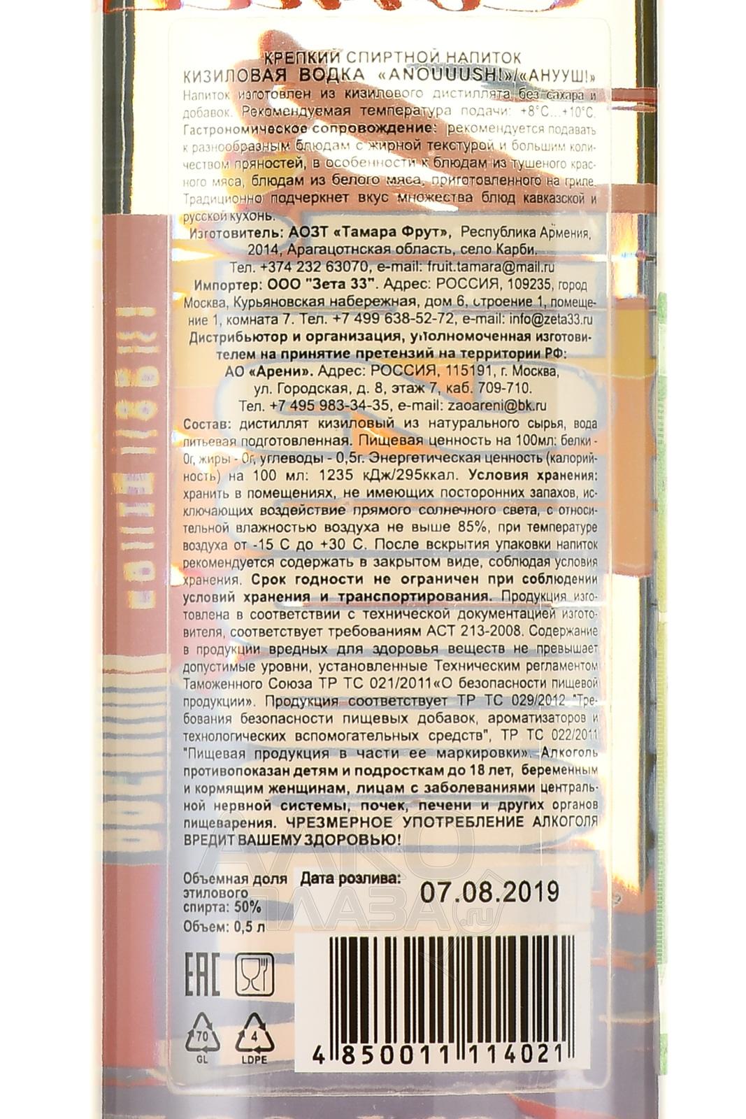 Водка Анууш Кизиловая 0,5 л изготавливается без сахара и каких-либо добавок. Армянский производитель — АОЗТ «Тамара Фрут» использует только органическое плодовое сырье (подтверждено сертификатом) и питьевую, прошедшую специальную обработку, воду. Спелый кизил, выращенный в Арагацотнской области, прессуют, получая сусло, которое сбраживают и перегоняют в медных кубах. Дистиллят разбавляет до крепости 50% и без всяких дальнейших манипуляций бутилируется.