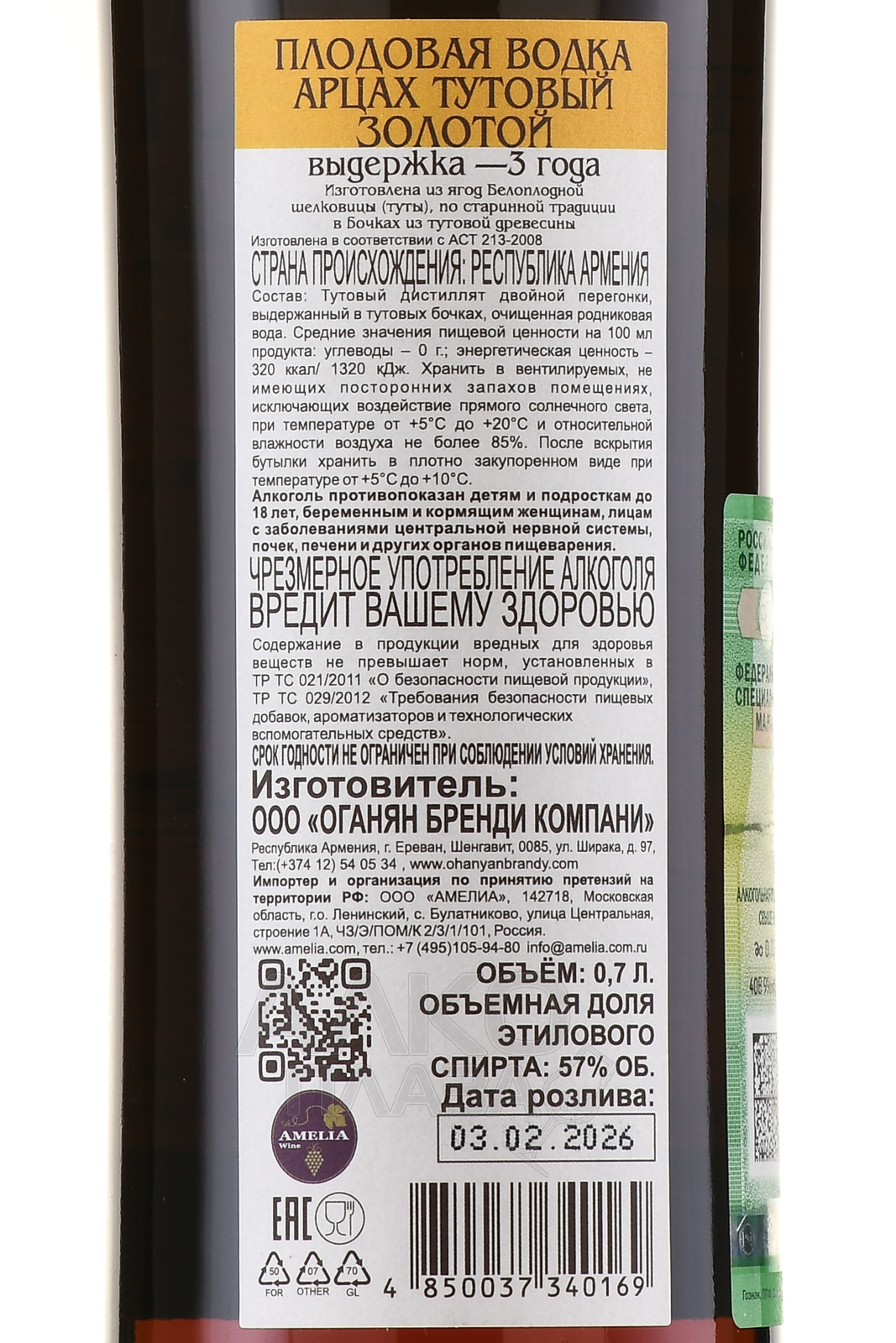 Водка Арцах Тутовый Золотый 3 года 0.7 л в п/у