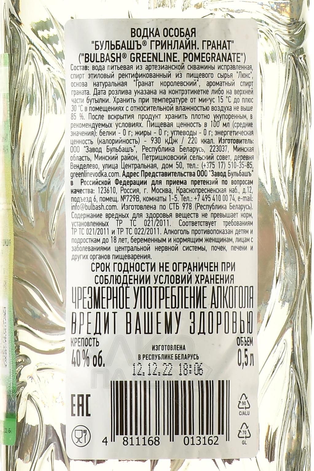 Водка Бульбашъ Гринлайн Гранат 0.5 л — классический алкоголь из Белоруссии класса премиум с приятным ароматом королевского граната и немного терпким водочным вкусом. Производится 40-градусная водка на современном оборудовании, привезенным из Италии, из натуральных ингредиентов — это отборное зерно, закупаемое в России и Молдове, а также природная артезианская вода.