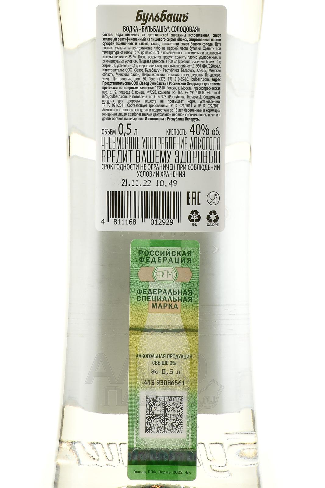 Водка Бульбашъ Солодовая 0.5 л — качественный 40-процентный алкоголь Белоруссии, созданный из таких ингредиентов, как вода из артезианских скважин, а в качестве сырья для спирта производитель использует пшеницу и настой ячменного солода — благодаря ему премиальная водка и получила свое название.