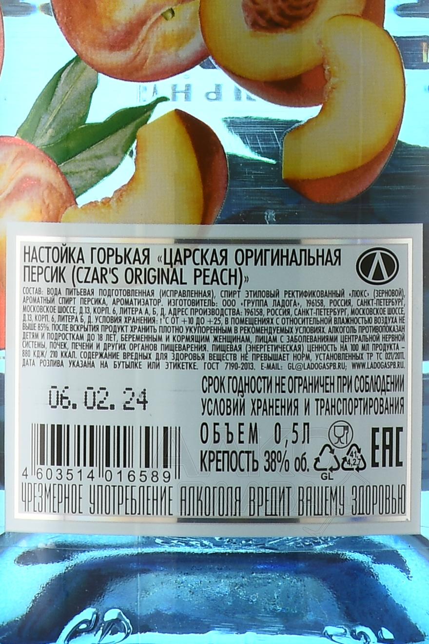 Водка Царская Оригинальная Персик 0,5 л — российский качественный алкогольный напиток с натуральной фруктовой добавкой. В этой роли фигурирует спирт из спелых персиков, смешанный с привычным ректификатом на основе зерновых с плодородных полей нашей страны. Для формирования крепости 38% водку купажировали чистейшей водой из родникового источника, прошедшей легкую очистку на профессиональном оборудовании.