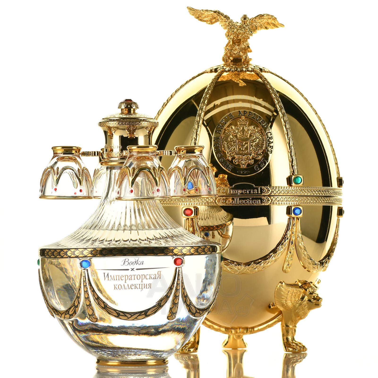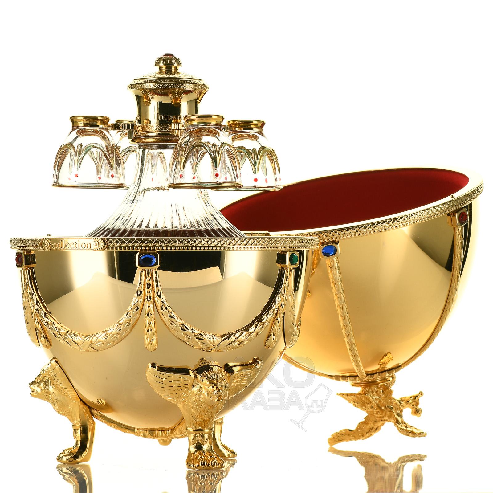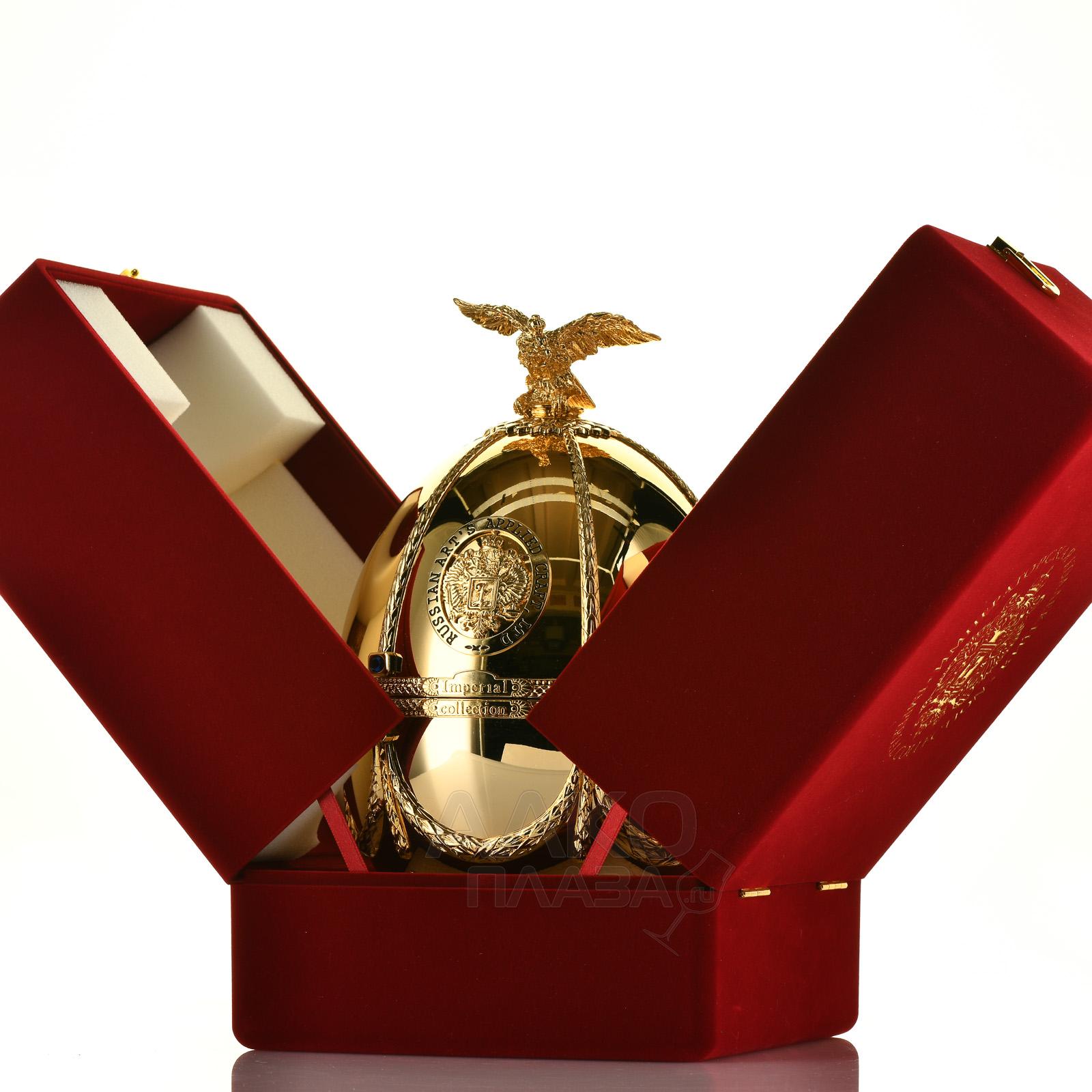 Водка Императорская Коллекция Супер-премиум Фаберже золото 0.7 л в п/у — роскошный презент, который никого не оставит равнодушным. Его стоит выбрать для особенно торжественного повода, чтобы еще больше подчеркнуть его значимость. Коллекционный алкоголь находится в футляре в виде пасхального яйца Фаберже золотого цвета, которое украшено кристаллами, логотипом и фигуркой орла. Опоры выполнены в виде львиных лап. Внутри находится графин из венецианского стекла в комплекте с 4 стопками. Посуда украшена позолоченными элементами. Водка произведена из спирта высшей категории, который изготавливается путем ректификации из соложеной пшеницы сорта Саратовская. Особые оттенки вкуса напитку придает вода из Ладожского озера. Алкоголь подвергается многоступенчатой фильтрации с помощью березового угля, ионов серебра и специальных мембран. Премиальный презент упакован в деревянный ящичек, отделанный красным бархатом.